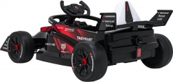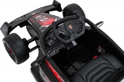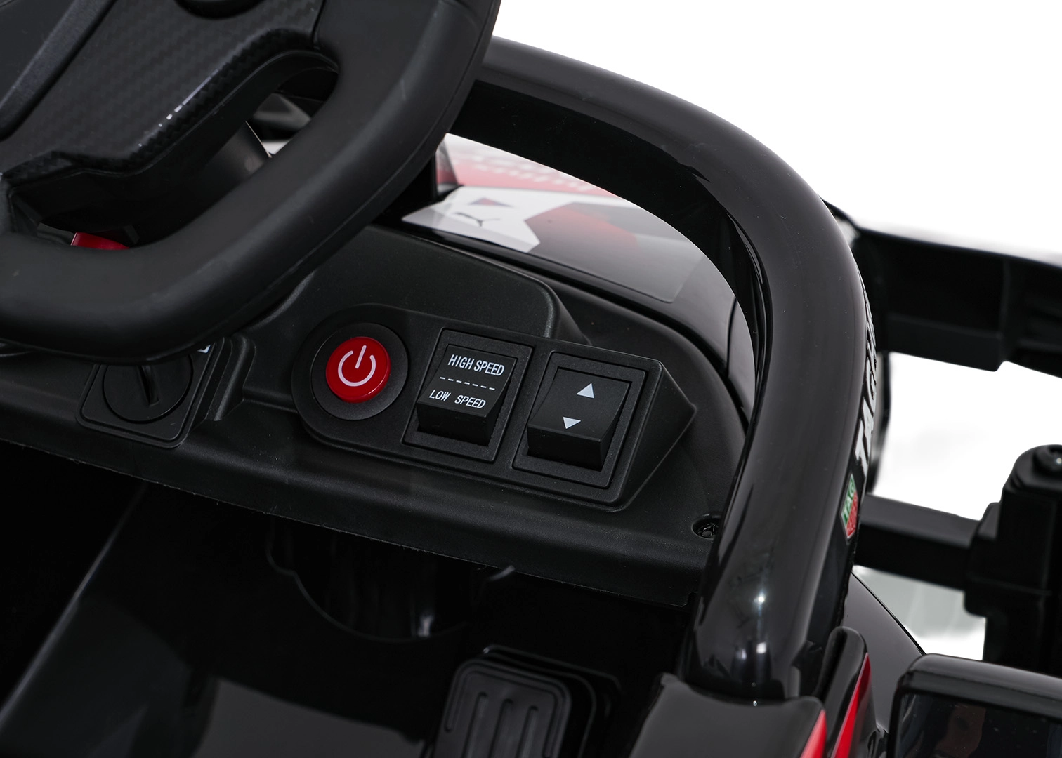 Pilot 2,4 GHz z 3 prędkościami i awaryjnym przyciskiem Stop. Panel audio z Bluetooth/USB/MP3, dźwiękami i klaksonem na kierownicy.