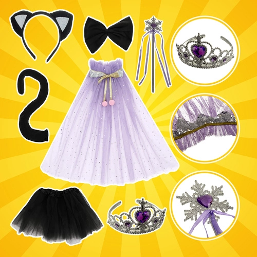 - Tiulowa spódniczka (tutu), pelerynka, korona, magiczna różdżka, opaska z kocimi uszkami, ogonek, muszka