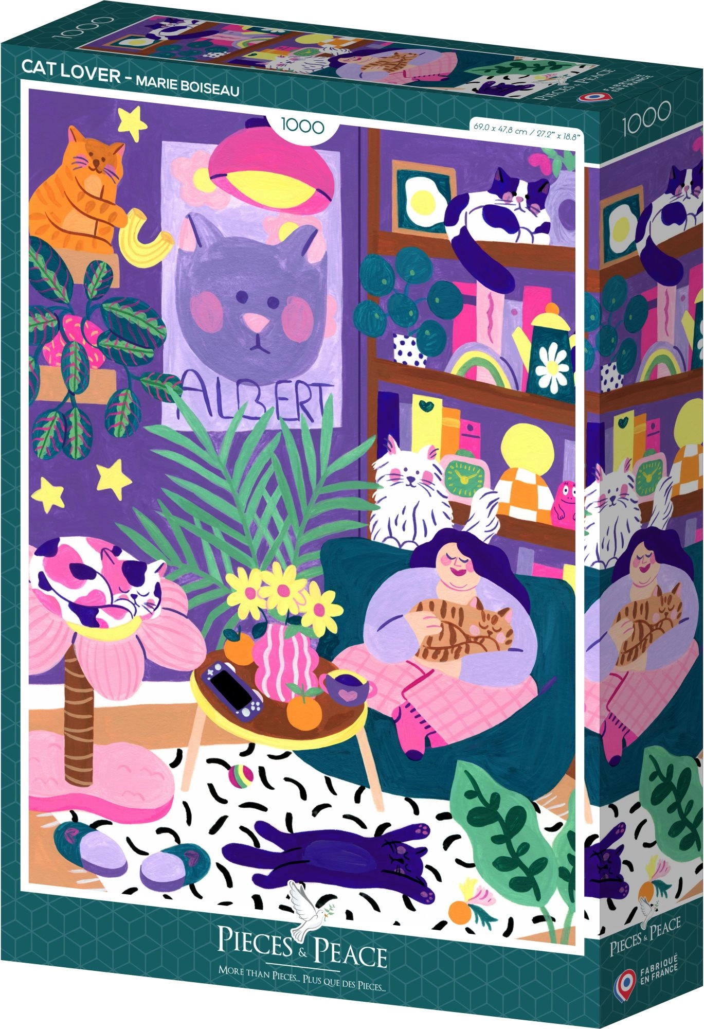 Zanurz się w świecie kotów i ułóż szczegółowy motyw z 1000 elementów. Wymiary ułożonego obrazu to ok. 47,8 × 69 cm, więc gotowe puzzle pięknie zaprezentują się na ścianie lub na półce w ramie.