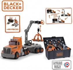 Ta solidna ciężarówka w ikonicznych barwach BLACK+DECKER skrywa w przyczepie praktyczny pojemnik z uchwytem, który utrzymuje całe narzędzie przejrzyście w jednym miejscu. Dzieci pokochają realistyczną dziecięcą wiertarkę oraz bogaty zestaw nasadek i elementów do budowania.