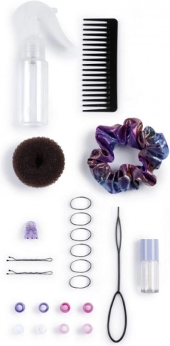 - 23 szt. akcesoriów (gumki, wsuwki, koraliki, wypełniacz do koka, grzebień, pętelki itp.)