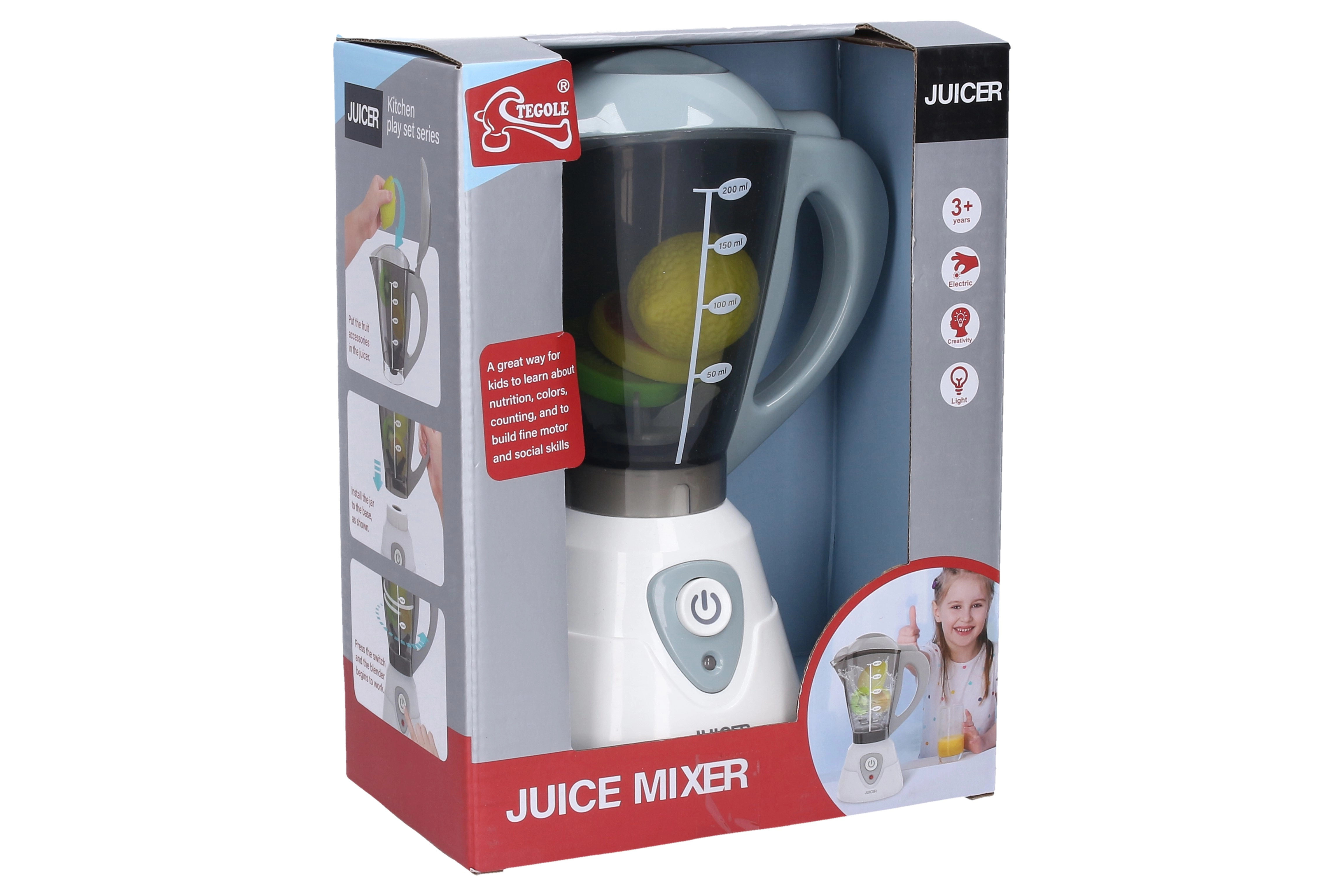 Dziecięcy mikser z owocami to świetny dodatek do każdej dziecięcej kuchni. Dzięki prostemu przełącznikowi on/off i efektom świetlnym działa jak prawdziwe urządzenie kuchenne i pobudza kreatywną i naśladowczą zabawę.