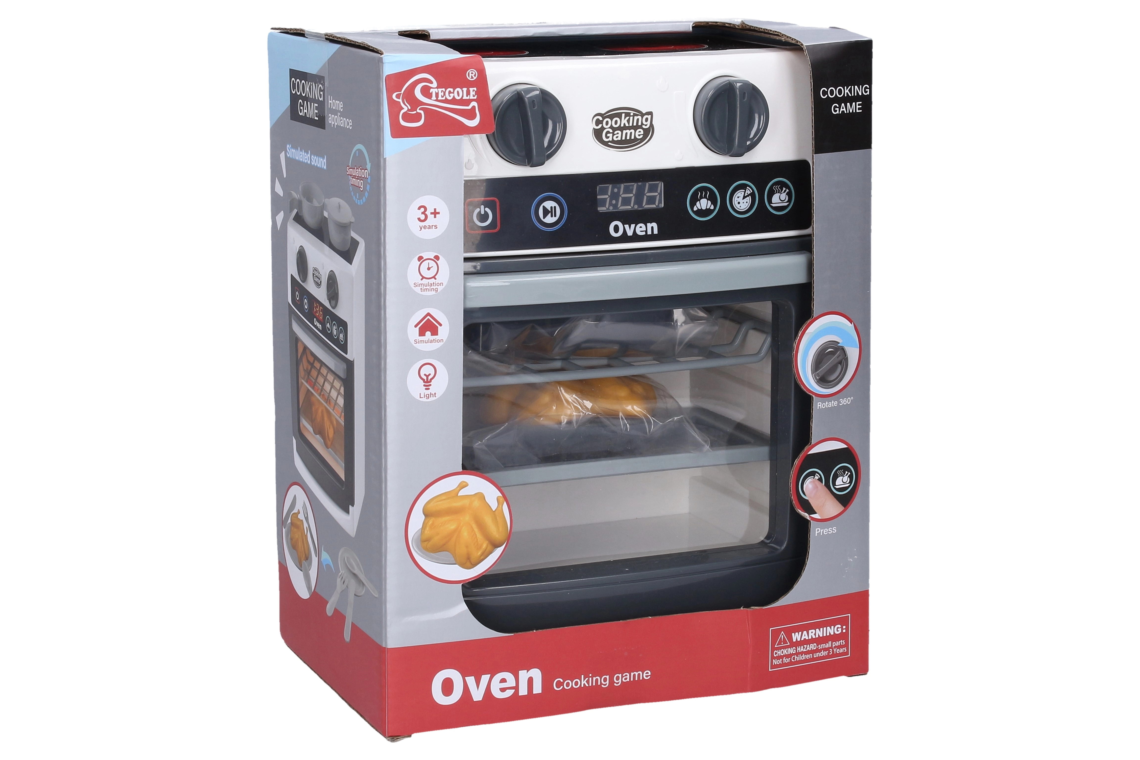 Realistyczny dziecięcy piekarnik o wymiarach 20 × 13,8 × 25,5 cm zapewnia świetną zabawę w gotowanie. Oferuje efekty świetlne i dźwiękowe, sterowanie przyciskami oraz odliczanie pieczenia. W zestawie znajduje się naczynie i kurczak dla jeszcze bardziej autentycznych wrażeń. Aby urządzenie działało prawidłowo, drzwiczki muszą być zamknięte. Zasilanie 3× AA (brak w zestawie).