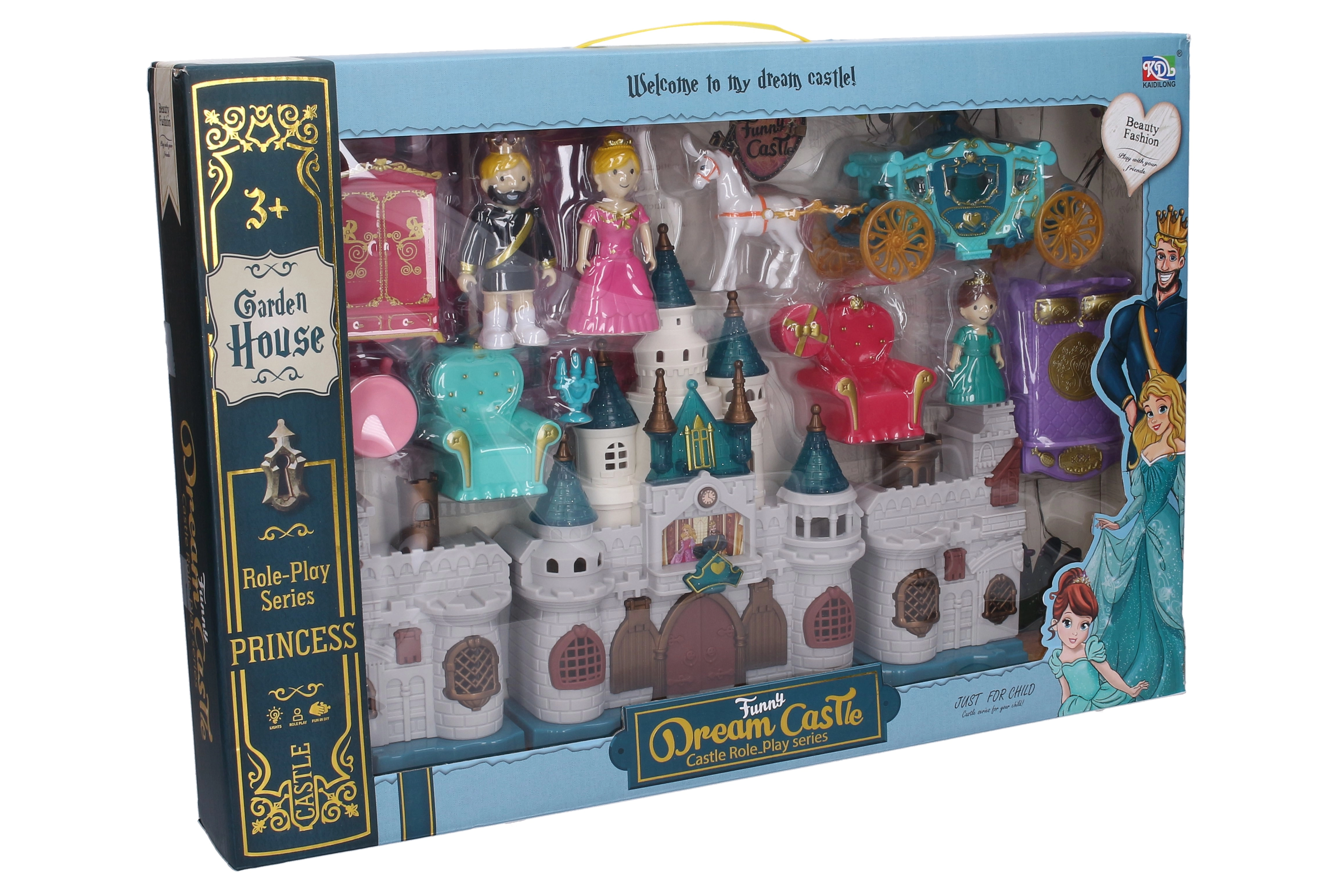 Rozkładany zamek o wysokości 23 cm przenosi dzieci w magiczny świat fantazji. Zestaw zawiera zamek, 3 postacie, meble oraz powóz z koniem. Dzięki przyciskowi w kształcie zegara uruchamiane są efekty świetlne i dźwiękowe, które dodatkowo potęgują zabawę. W opakowaniu znajdują się 3× bateria AG13, więc dzieci mogą bawić się od razu po rozpakowaniu.