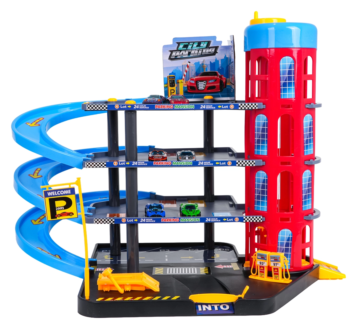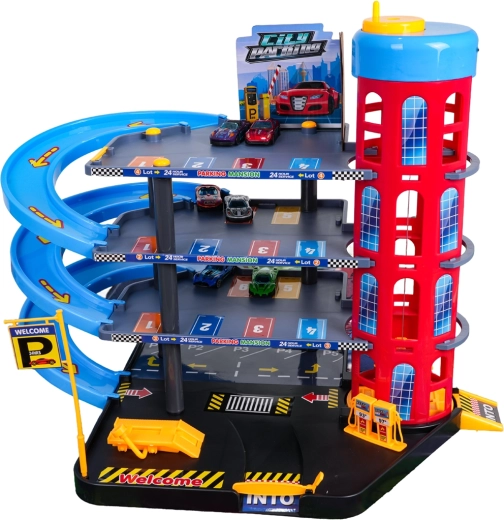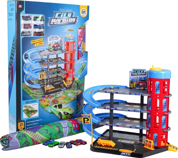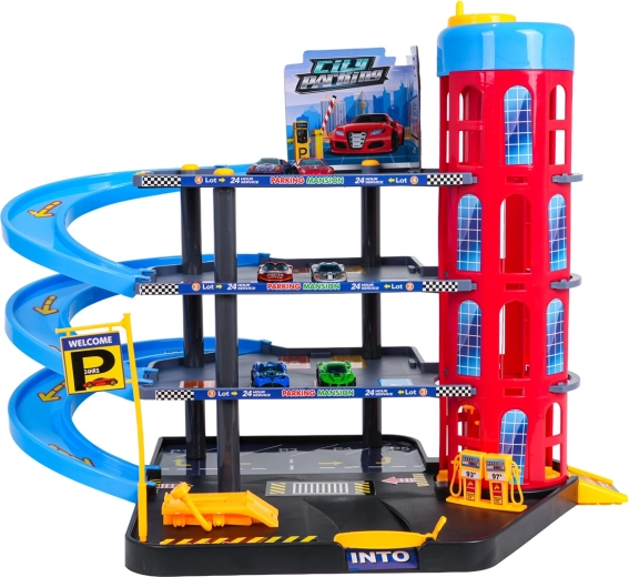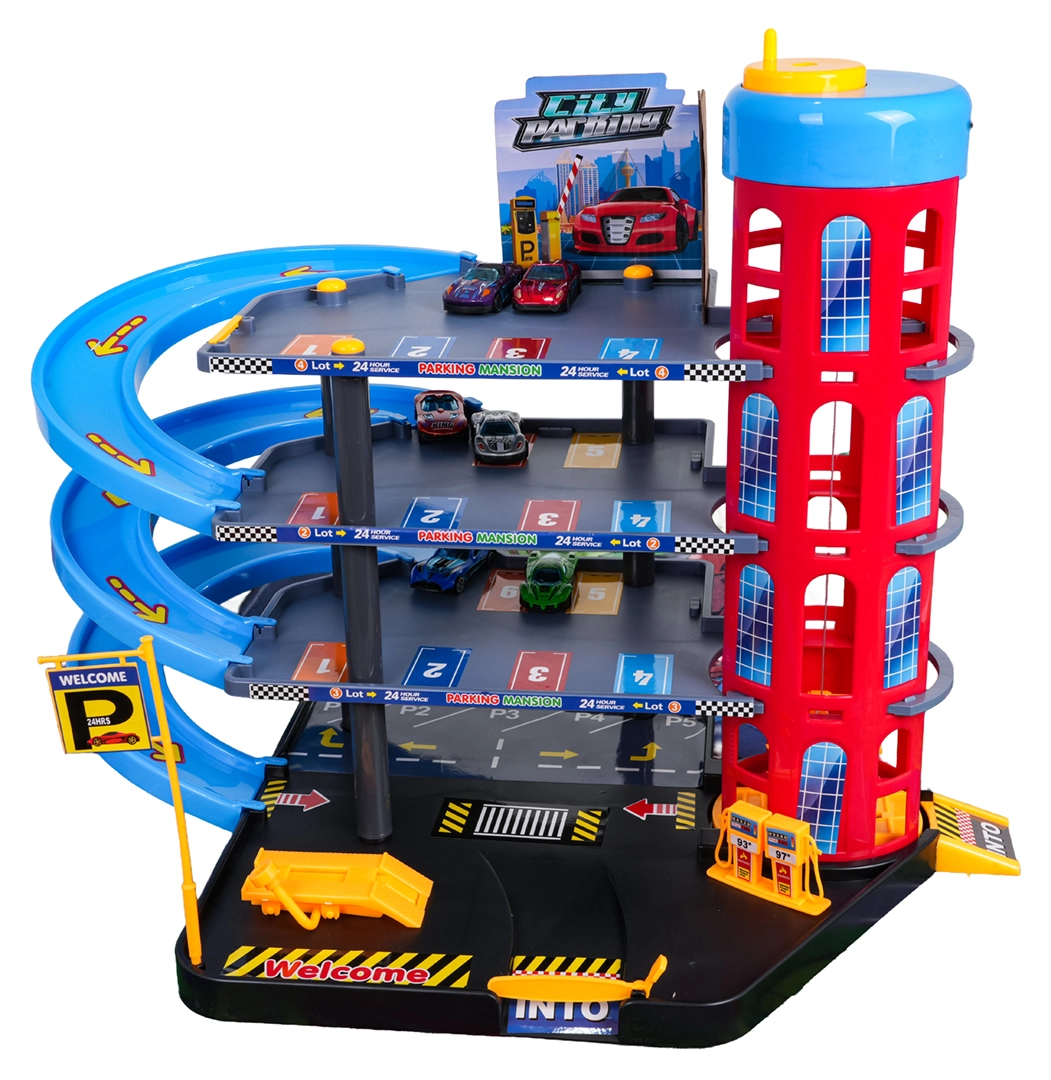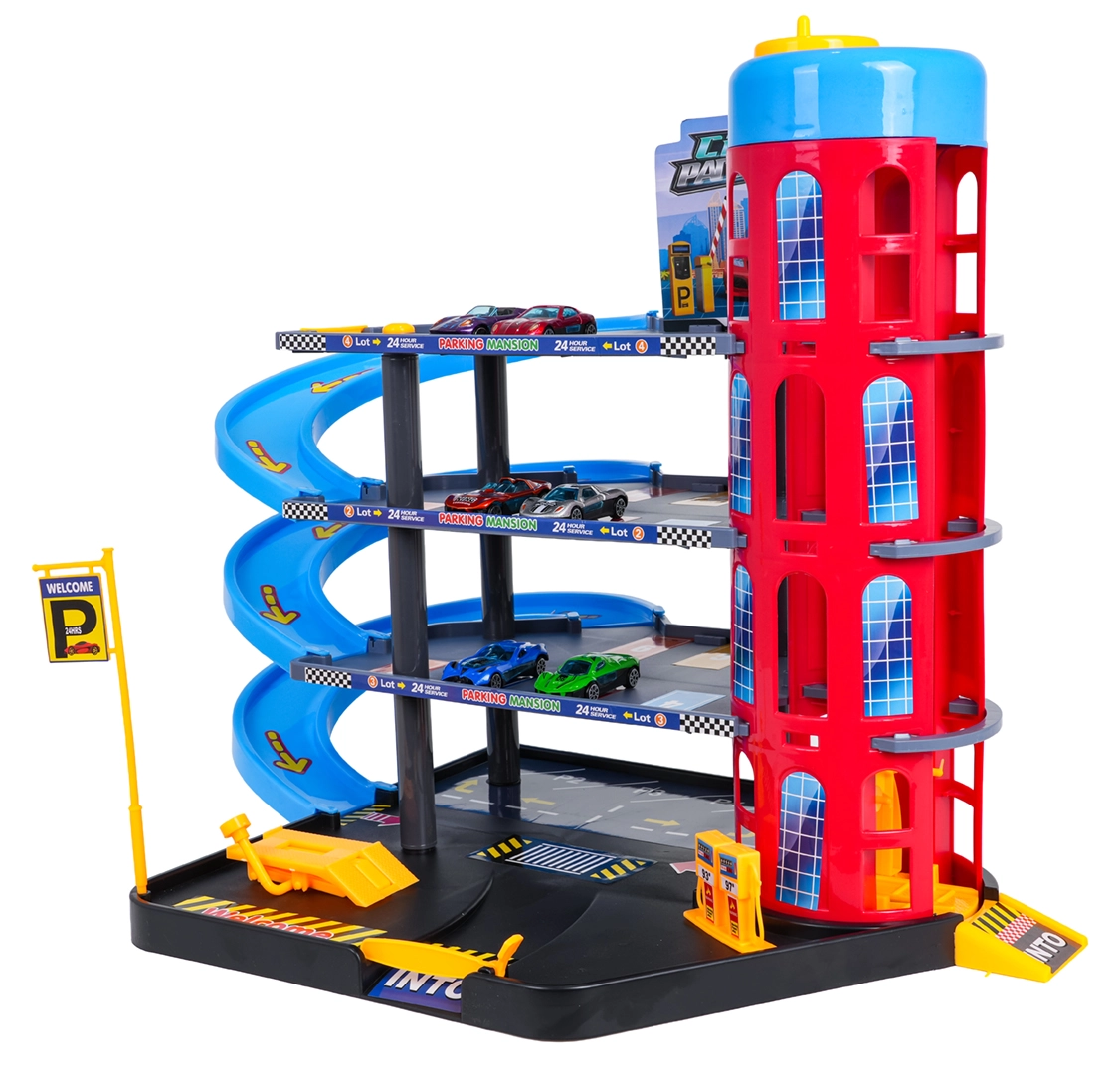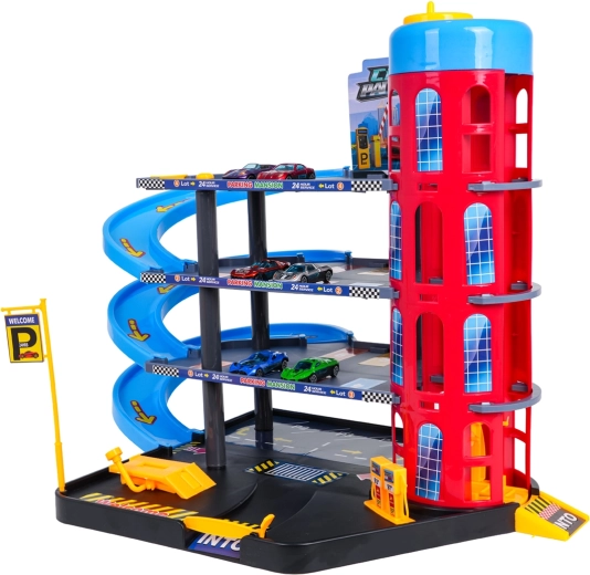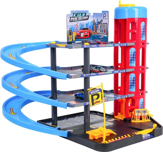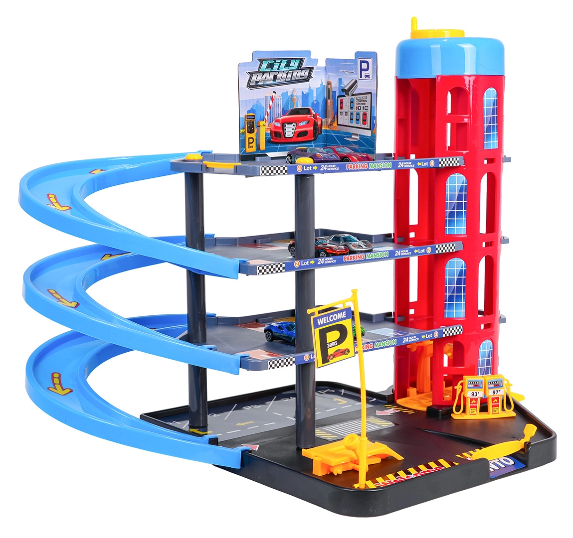 Ten kolorowy, wielopoziomowy parking łączy realistyczne elementy miasta z dynamiczną jazdą. Dzieci mogą wciągać autka ręcznie sterowaną windą, parkować na poszczególnych poziomach i puszczać je po spiralnych rampach. Zintegrowana stacja paliw, podnośnik serwisowy i wjazd z szlabanem wspierają wyobraźniową zabawę.