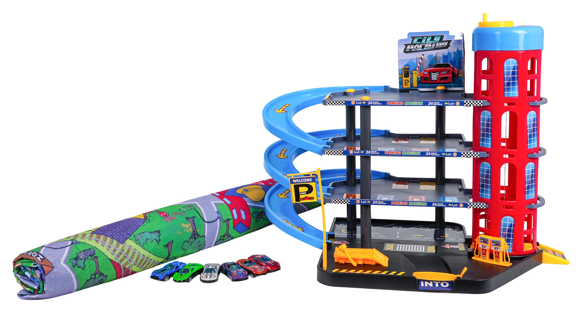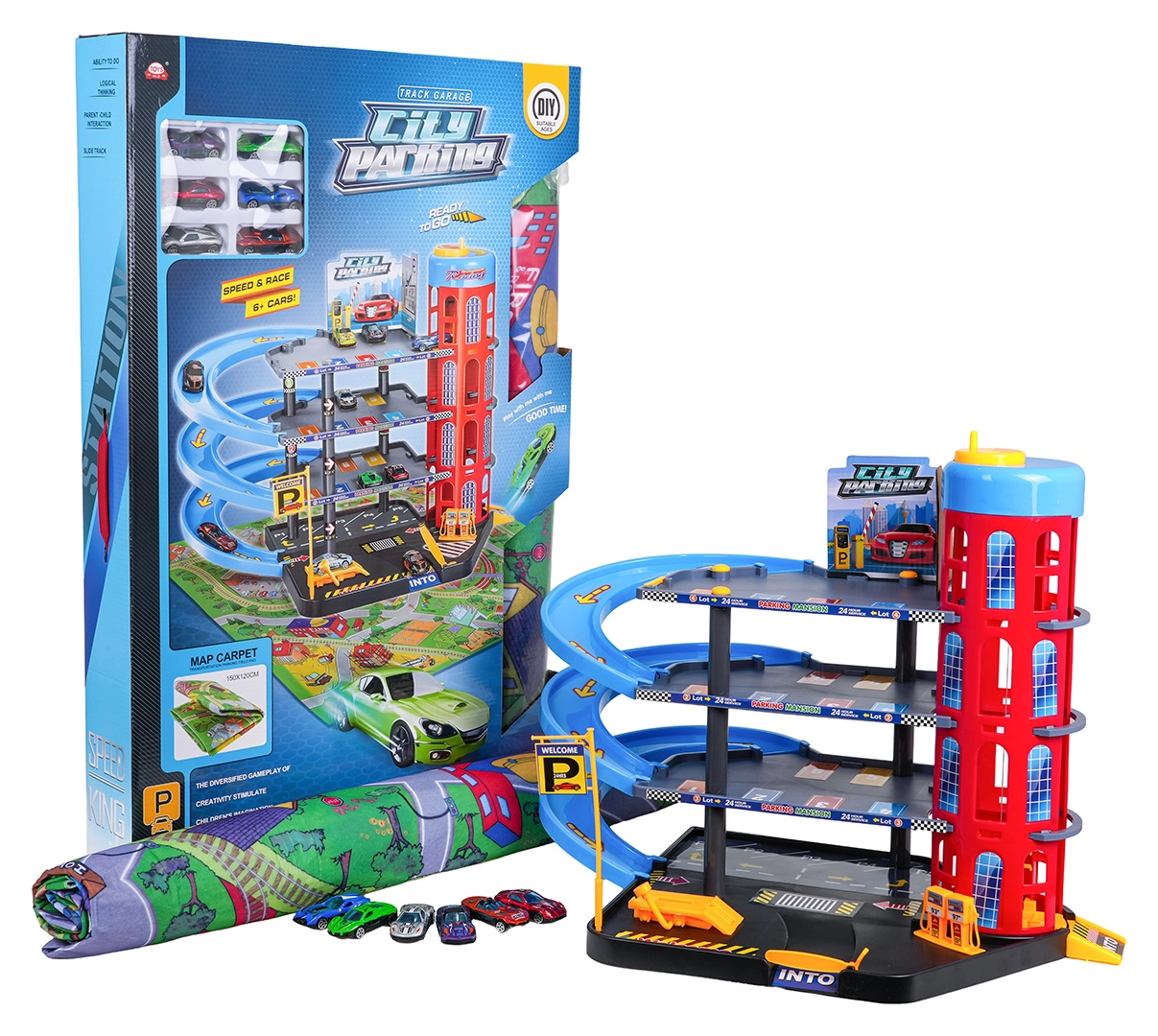 Zabawny, wielopoziomowy parking dla dzieci od 3 lat oferuje ręczną windę, spiralne zjazdy, stację paliw oraz podnośnik serwisowy. W zestawie duża filcowa mata do zabawy z drogami i 6 metalowych autek na długie godziny kreatywnej zabawy i wyścigów.