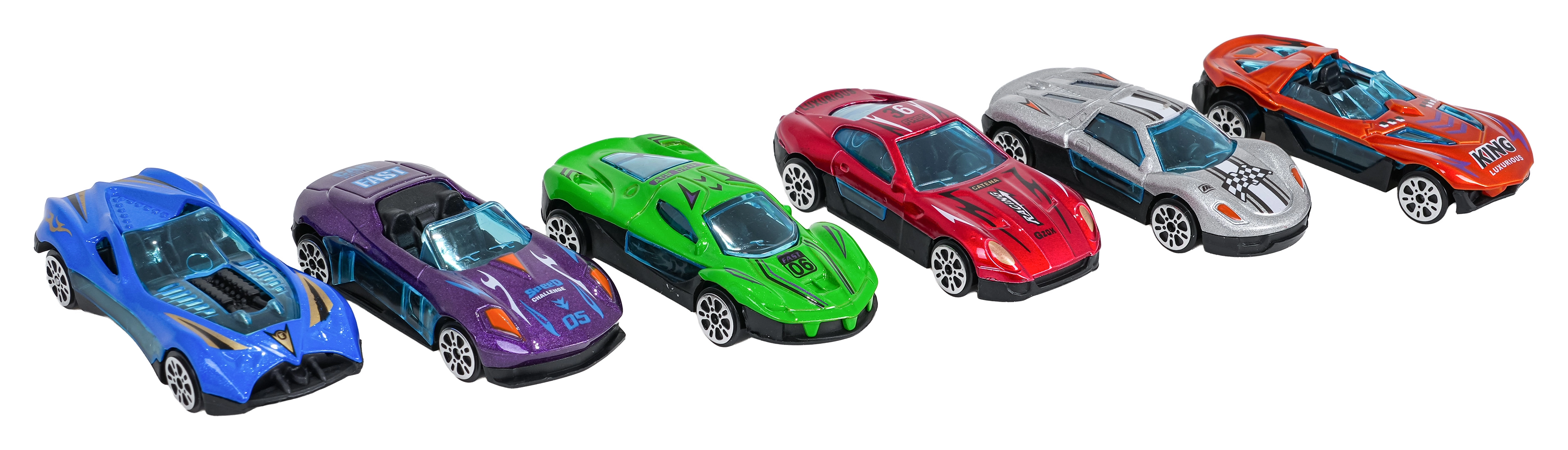 Gotowe do zabawy od razu: sześć wytrzymałych aut z metalową karoserią, płynnym toczniem kół i sportowymi nadrukami do niekończących się wyścigów.