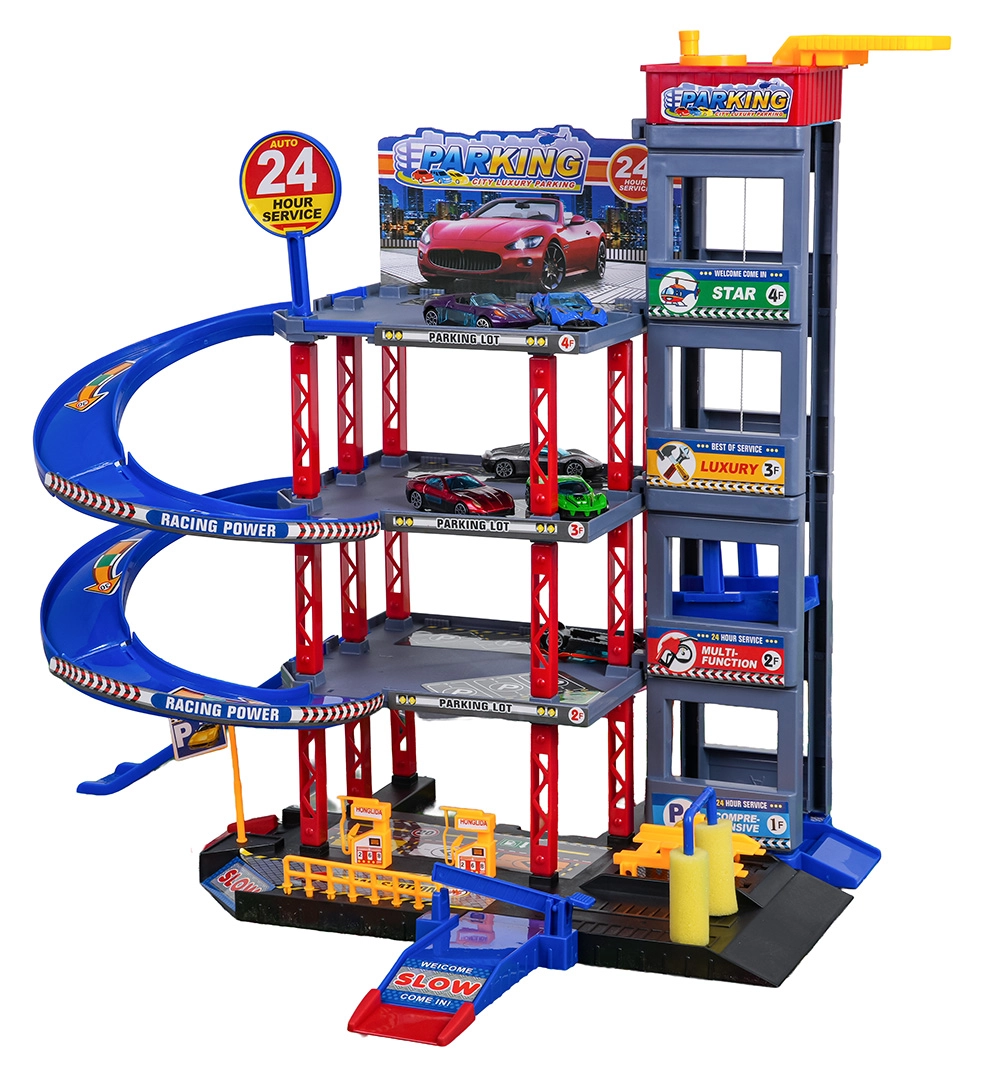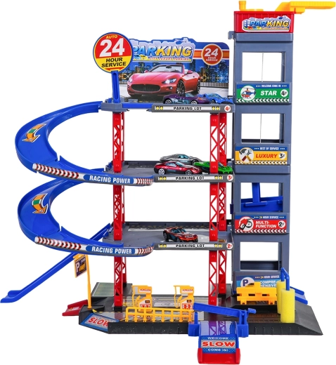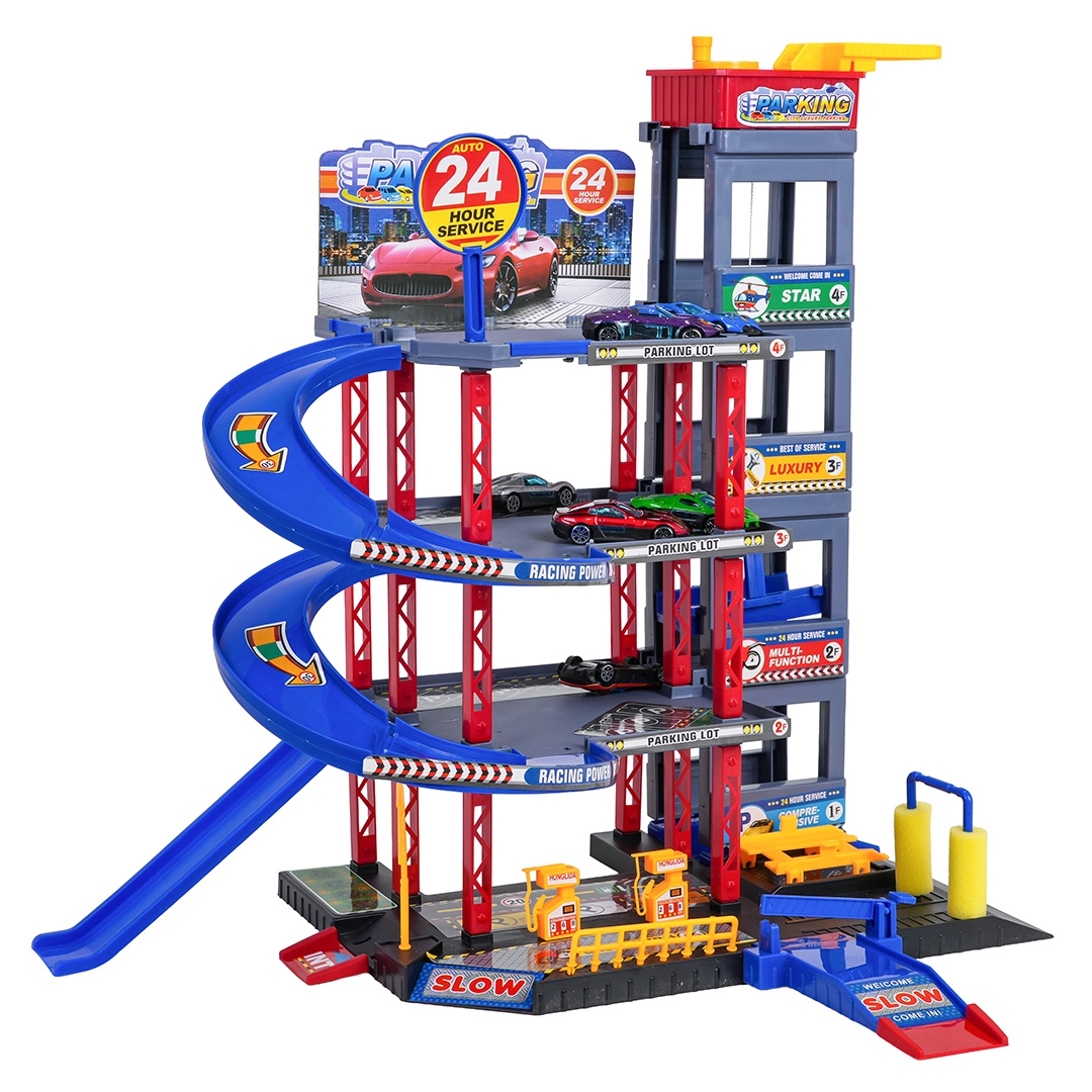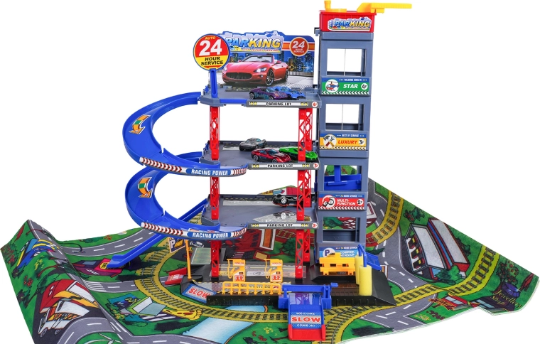 Odkryj zabawę dla małych kierowców: solidny wielopoziomowy parking z ręczną windą, spiralnymi rampami oraz dużą matą do zabawy z drogami. W zestawie znajduje się 6 metalowych autek, stacja paliw, myjnia, podziemny serwis z podnośnikiem oraz zjazdy wyścigowe dla dynamicznej zabawy i rozwoju motoryki.