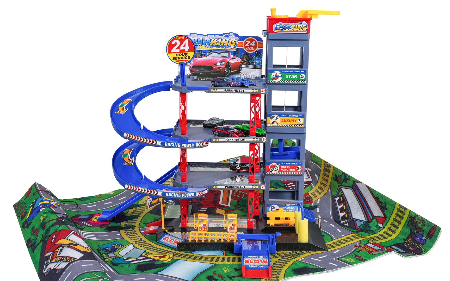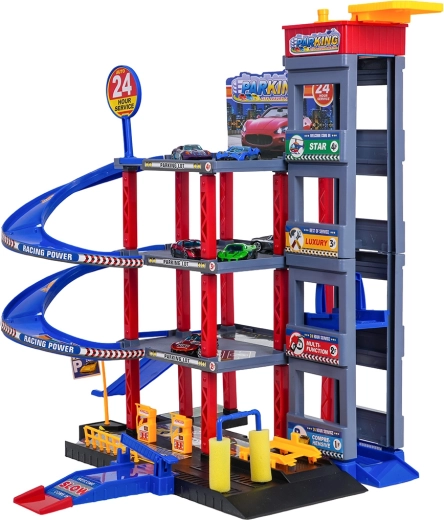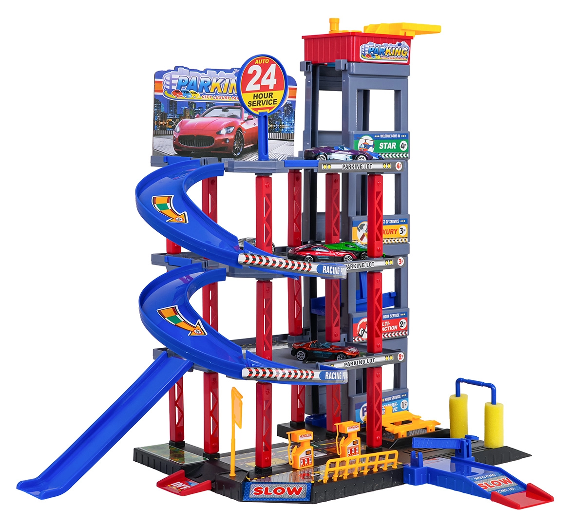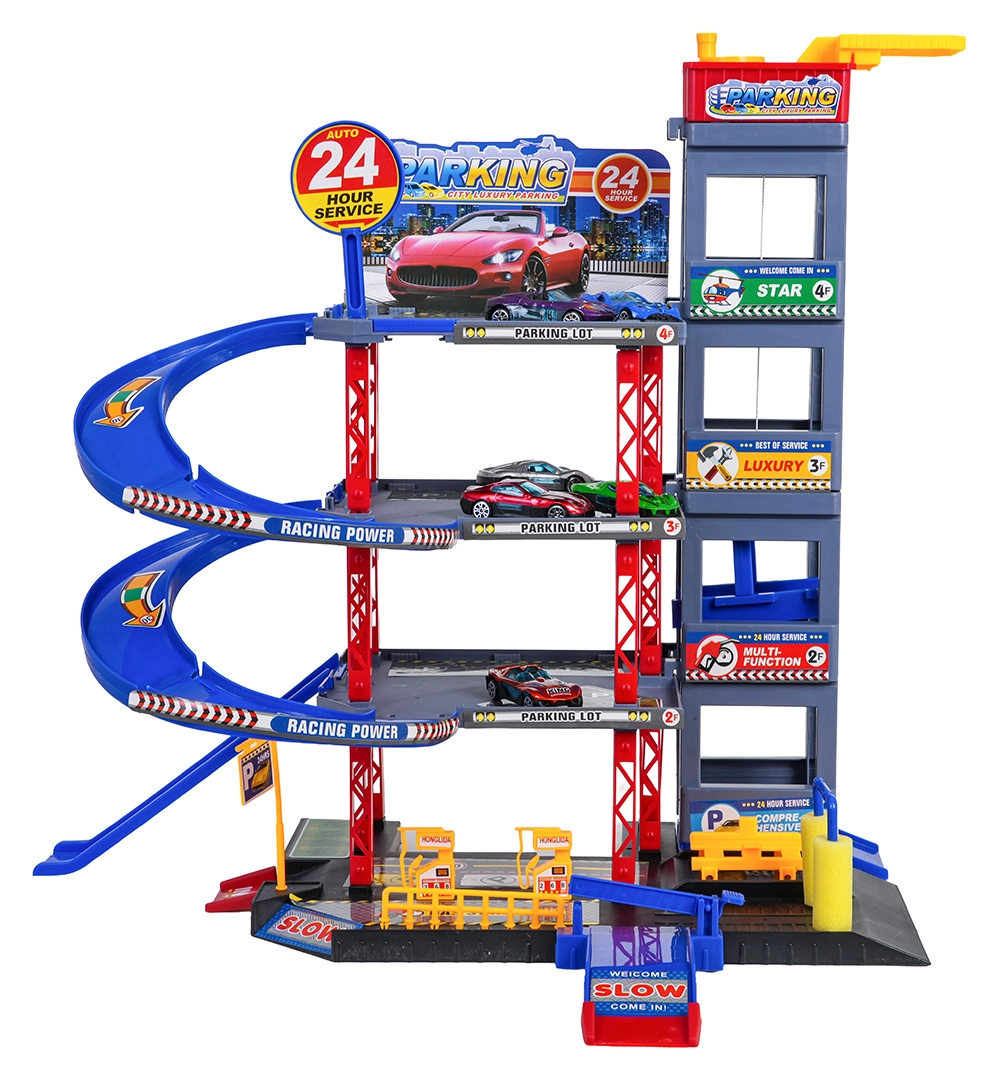 Odkryj zabawę dla małych kierowców: solidny wielopoziomowy parking z ręczną windą, spiralnymi rampami oraz dużą matą do zabawy z drogami. W zestawie znajduje się 6 metalowych autek, stacja paliw, myjnia, podziemny serwis z podnośnikiem oraz zjazdy wyścigowe dla dynamicznej zabawy i rozwoju motoryki.