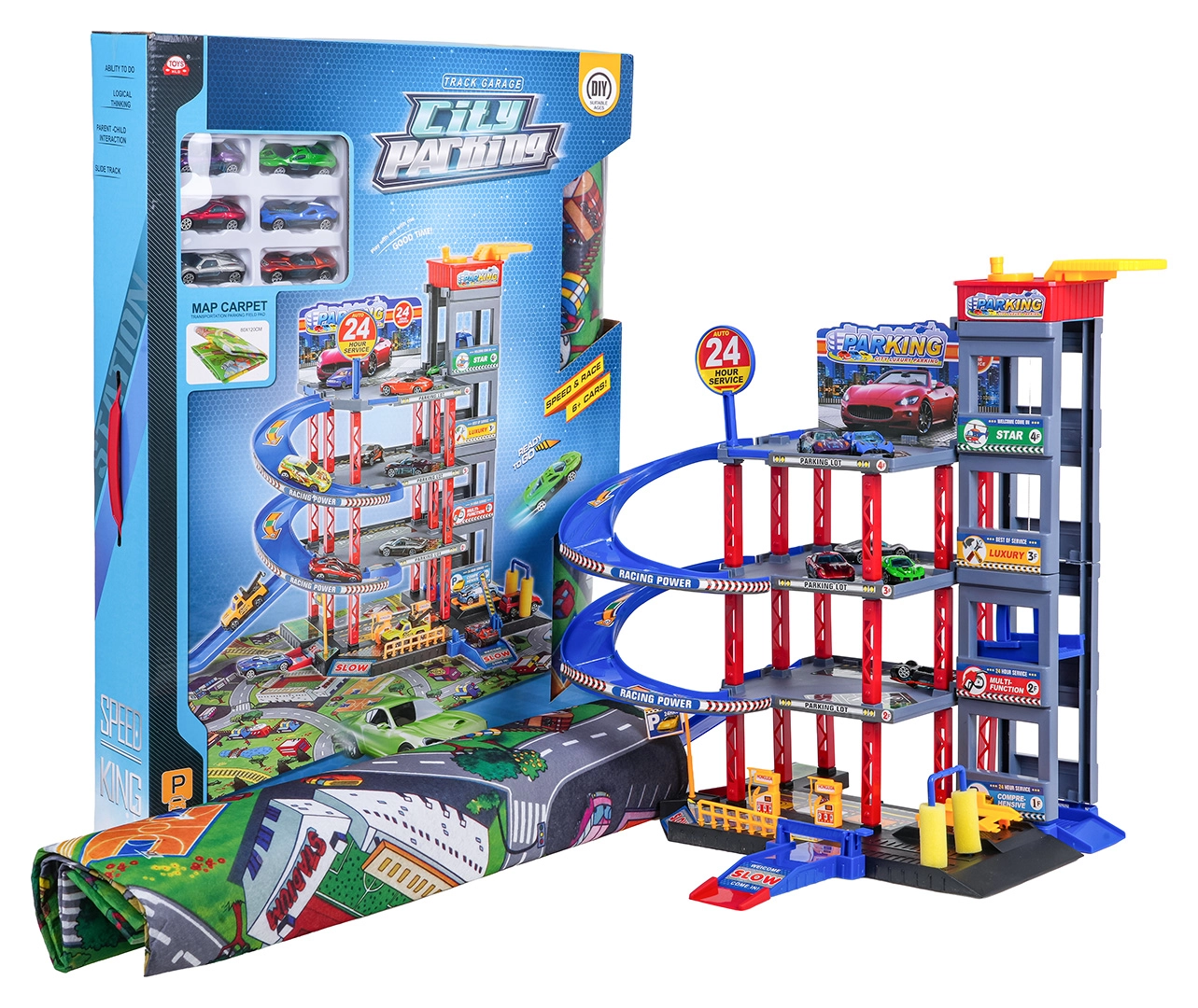 - elementy konstrukcyjne parkingu, mata do zabawy z drogami, 6 autek z metalową karoserią, pachołki i barierki, dekoracyjne naklejki, instrukcja obrazkowa