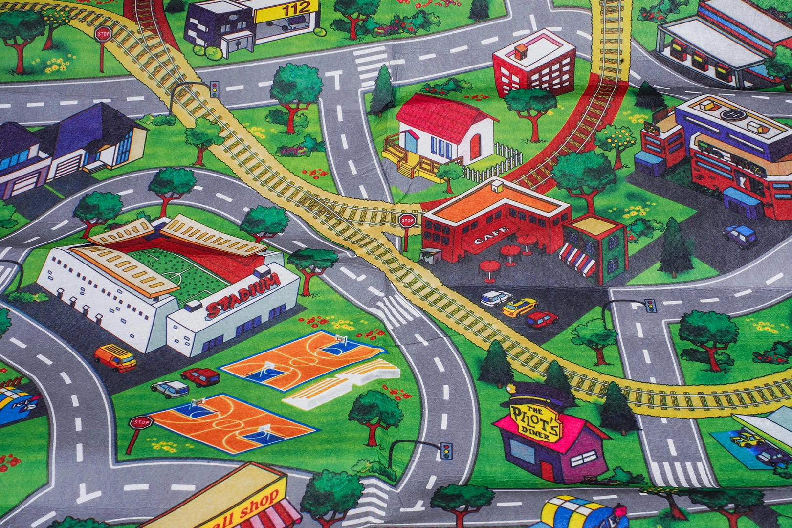 Duża filcowa mata z ulicami rozszerza przestrzeń zabawy. W opakowaniu znajdziesz 6 metalowych autek, znaki, barierki oraz naklejki.