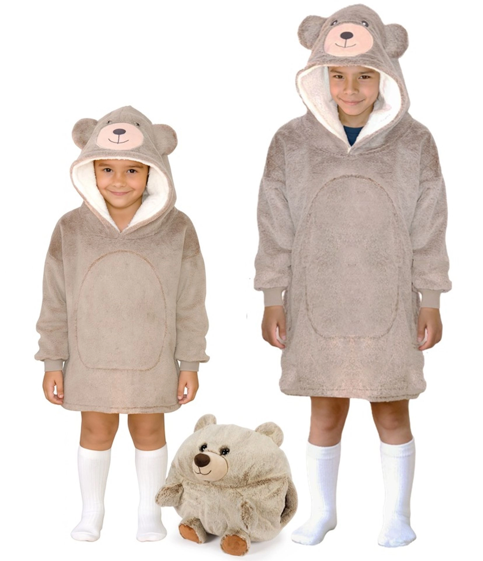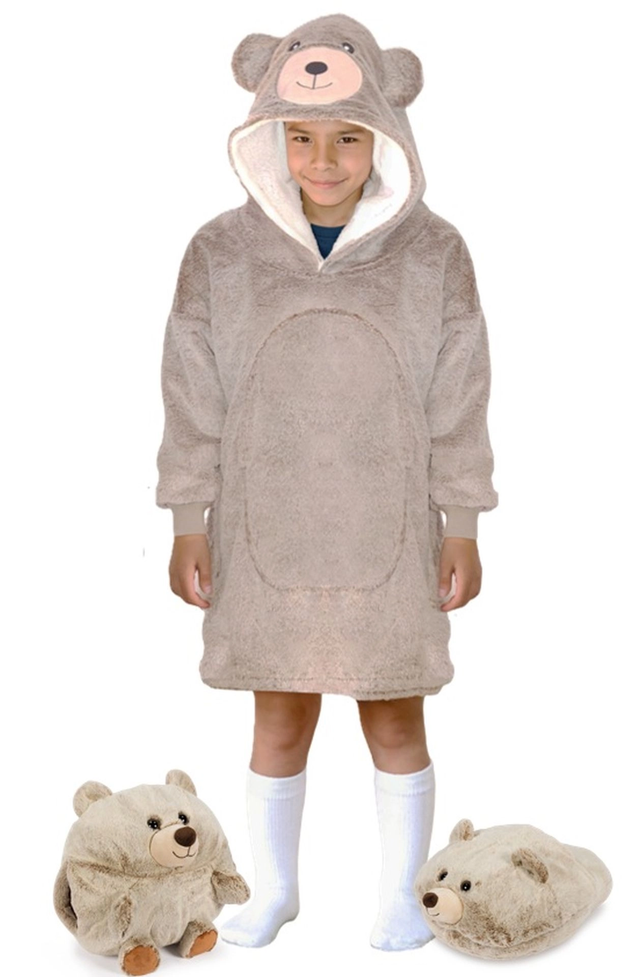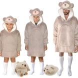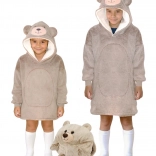 Duży kaptur z misiowymi uszami i zabawny wygląd sprawiają, że koc-bluza to ulubiony element garderoby dzieci – stylowy i funkcjonalny.
