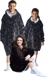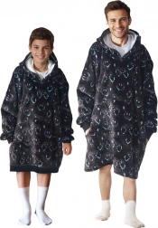Praktyczne detale, takie jak duży kaptur i pojemna kieszeń kangurka, utrzymują głowę i dłonie w cieple. Koc-bluza ma uniwersalny dziecięcy rozmiar o długości do kolan i jest odpowiednia dla dzieci od 7 do 12 lat. Łatwa pielęgnacja w pralce ułatwia codzienne użytkowanie.