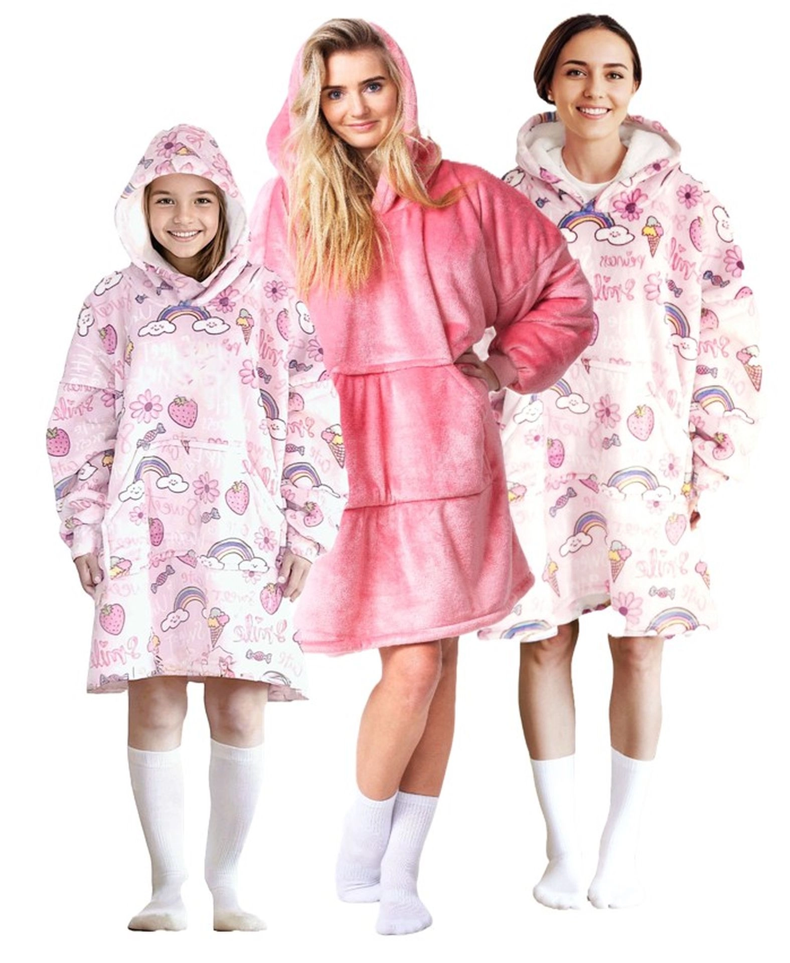 Dzięki kapturowi i dużej przedniej kieszeni utrzymasz ciepło od głowy po dłonie. Świetna do domowego relaksu, pracy przy komputerze, czytania oraz aktywnych chwil na zewnątrz, takich jak biwakowanie czy chłodniejsze wieczory w ogrodzie. Nadruk pełen słodkości, tęczy i chmurek rozjaśni każdy dzień.