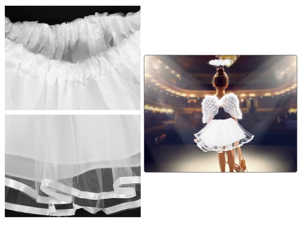 Wielowarstwowa tiulowa spódniczka jest lekka i przewiewna. Elastyczny pas łatwo dopasowuje się – około 18–30 cm w obwodzie, długość spódniczki ok. 32 cm. Doskonała dla swobody ruchów i całodziennego komfortu.