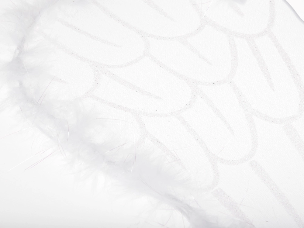 Dekoracyjne skrzydła z piórkowym brzegiem są lekkie i trzymają się na elastycznych gumkach. Wymiary około 42 cm szerokości i 33 cm wysokości – łatwo się dopasowują i pięknie wypadają na zdjęciach.