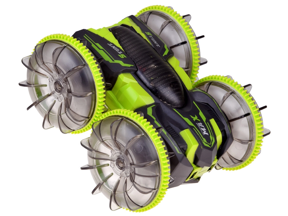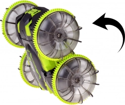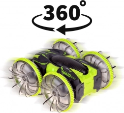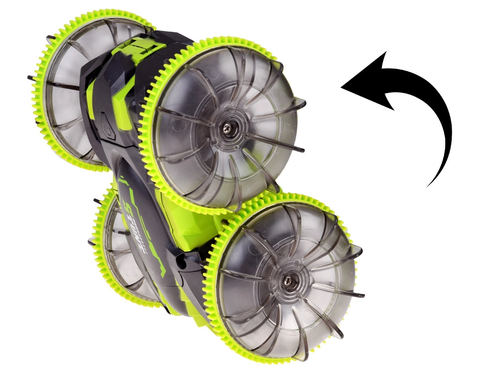 Poczuj adrenalinę z amfibijnym kaskaderskim autem RC, które radzi sobie z trawą, dywanem, płytkami oraz powierzchnią wody. Duże transparentne koła z wyrazistym bieżnikiem i podświetleniem LED zapewniają doskonałą przyczepność i efektowny wygląd podczas jazdy, także po zmroku. Dzięki obrotowi 360° pojazd jedzie dalej nawet po przewróceniu.