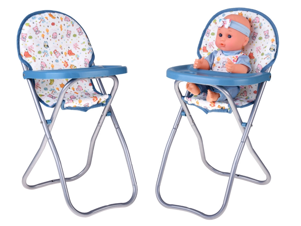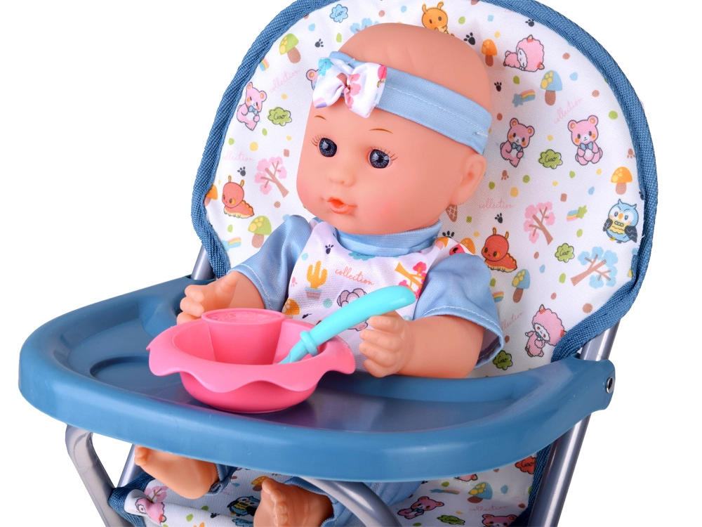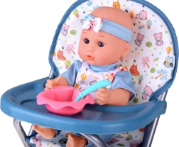 Stabilne, składane krzesełko z tacką i miejscem na miseczkę oraz sztućce. Wspiera realistyczną zabawę w karmienie i wspólne posiłki z lalką.