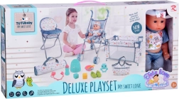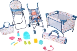 - Zestaw dla lalki – lalka niemowlę z wózkiem, łóżeczkiem, krzesełkiem i akcesoriami