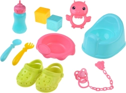 - Miseczka, łyżeczka, widelczyk, butelka, nocniczek, smoczek z łańcuszkiem, grzechotka, klocki, torba