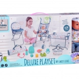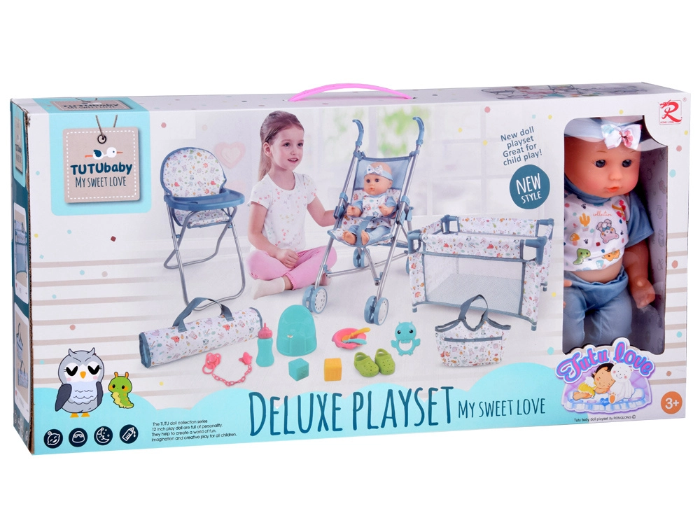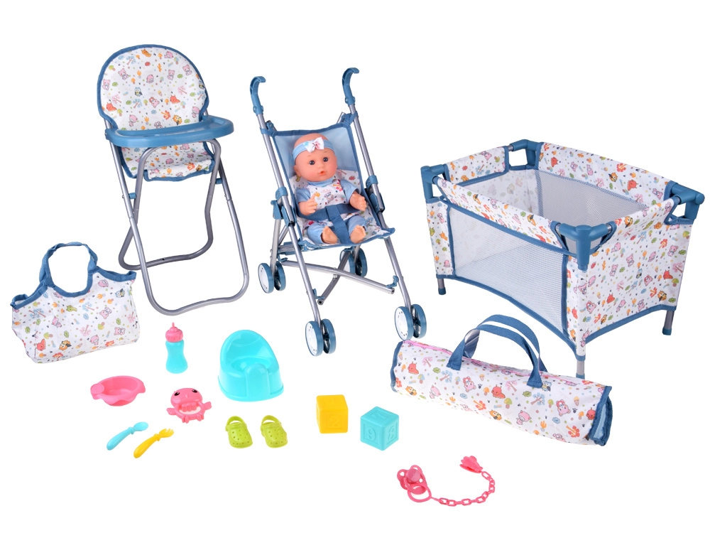 Deluxe zestaw lalka niemowlę z wózkiem, łóżeczkiem, krzesełkiem do karmienia i akcesoriami