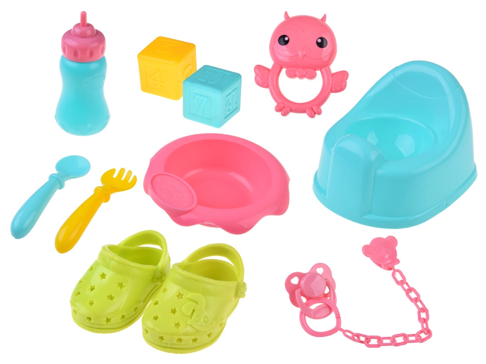 Miseczka, łyżeczka, widelczyk, butelka, nocniczek, smoczek z łańcuszkiem, grzechotka, klocki, torba