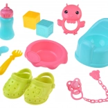 Praktyczne wyposażenie obejmuje zestaw do karmienia (miseczkę, sztućce i butelkę), nocniczek, smoczek z łańcuszkiem, kolorowe klocki i grzechotkę. Łóżeczko turystyczne z oddychającymi, siatkowymi bokami i torbą idealnie sprawdza się do zabawy i przechowywania. Dzięki bogatym akcesoriom dzieci łatwo naśladują prawdziwą opiekę nad niemowlęciem oraz rozwijają komunikację i małą motorykę.