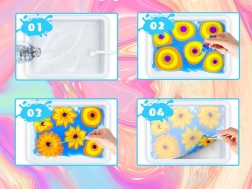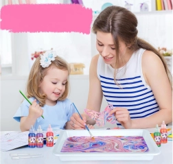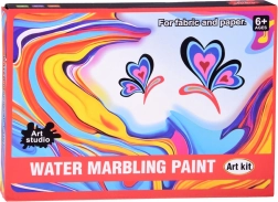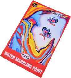 W opakowaniu znajdziesz wszystko, co potrzebne: 12 buteleczek farb (16 ml) z precyzyjną końcówką, plastikową kuwetę, papiery oraz zestaw narzędzi (pipety, grzebień, pędzelek, szpatułka itp.). Po zmieszaniu proszku z wodą stworzysz żelową kąpiel, do której kapiesz kolory i modelujesz wzór – następnie łatwo odbijasz go na papierze.