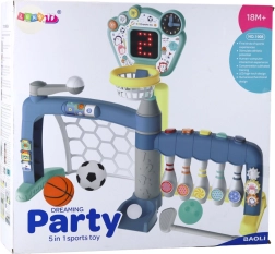 - bramka z siatką, kosz do koszykówki, tablica z punktacją LED i dźwiękiem, piłka do piłki nożnej, piłka do koszykówki, kula do kręgli, piłeczka do golfa, 5 kolorowych kręgli, pałka baseballowa, kij golfowy, zegar do nauki czasu, 3 zębate kółka do ćwiczeń dłoni, instrukcja