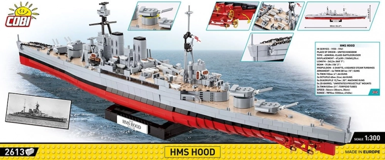 Legendarny brytyjski krążownik liniowy HMS HOOD należał do najsłynniejszych okrętów Royal Navy okresu międzywojennego i II wojny światowej. Ta precyzyjna konstrukcja w skali 1:300 wiernie oddaje sylwetkę i uzbrojenie słynnej jednostki – od długiego kadłuba z czerwoną linią wodną, przez bogato opracowaną nadbudówkę, po obrotowe wieże głównej baterii.