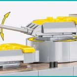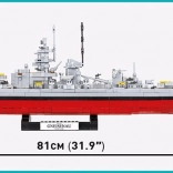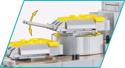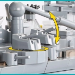 Okręt oferuje wiele funkcjonalnych detali: obrotowe wieże artyleryjskie z elewacją luf, ruchome śruby okrętowe i stery, realistyczny pokład i nadbudówki. W zestawie nie brakuje eleganckiej czarnej podstawki oraz białej tabliczki z nazwą jednostki. Intuicyjna instrukcja z czytelnymi piktogramami ułatwia budowę także mniej doświadczonym konstruktorom.