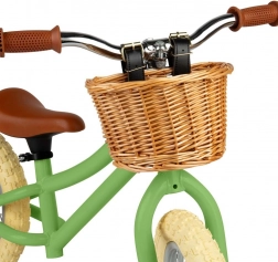 Elegancki wiklinowy koszyk na kierownicy na drobiazgi i zabawki. Brązowe chwyty i siodełko nadają rowerkowi ponadczasowy wygląd.