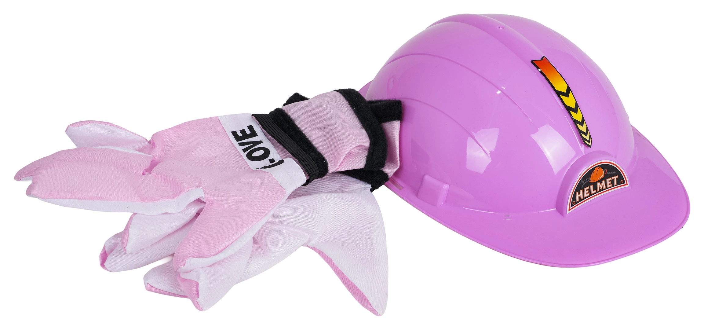W skład zestawu wchodzi różowy kask i miękkie rękawice dla bezpieczniejszej i bardziej realistycznej zabawy małych naprawiaczy.