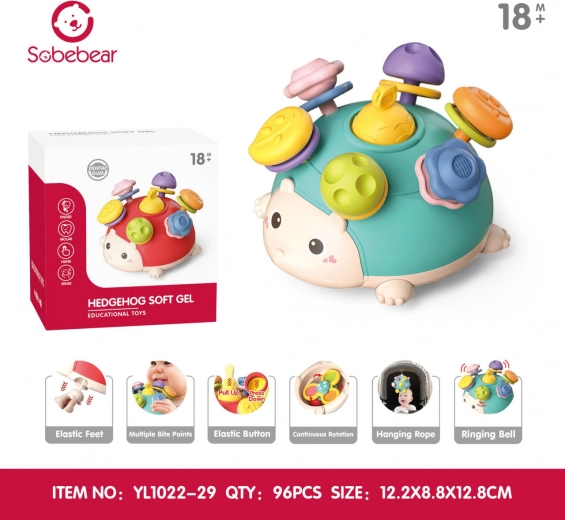 Uroczy jeżyk dla dzieci od 18 miesięcy oferuje multifunkcyjną stymulację sensoryczną i mnóstwo możliwości zabawy. Wykonany z bezpiecznych materiałów bez ostrych krawędzi, ma żywe kolory i różne faktury do odkrywania. Miękkie wypustki przynoszą ulgę podczas ząbkowania, a pod nimi kryją się kolorowe kółeczka z grzechotką. Jeżyk ma obrotowy spinner, elastyczne rączki i nóżki, a dzięki sznureczkowi do zawieszenia łatwo przymocujesz go np. do łóżeczka.