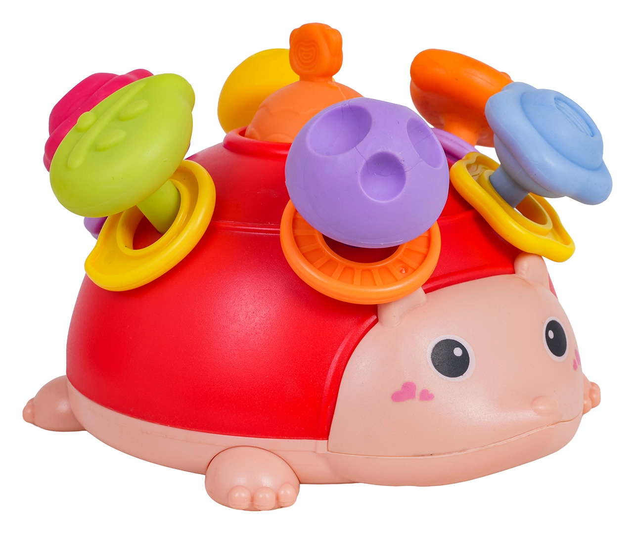 - miękkie teksturowane wypustki, grzechoczące kółka, środkowy element do wciskania/ciągnięcia, elastyczne kończyny na gumkach, dolny spinner, sznureczek do zawieszenia