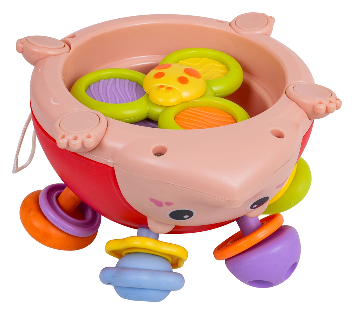 Pod wypustkami kryją się kolorowe kółka, które grzechoczą przy potrząsaniu. Dzieci mogą je zdejmować, ponownie zakładać i ćwiczyć koordynację oko–ręka.