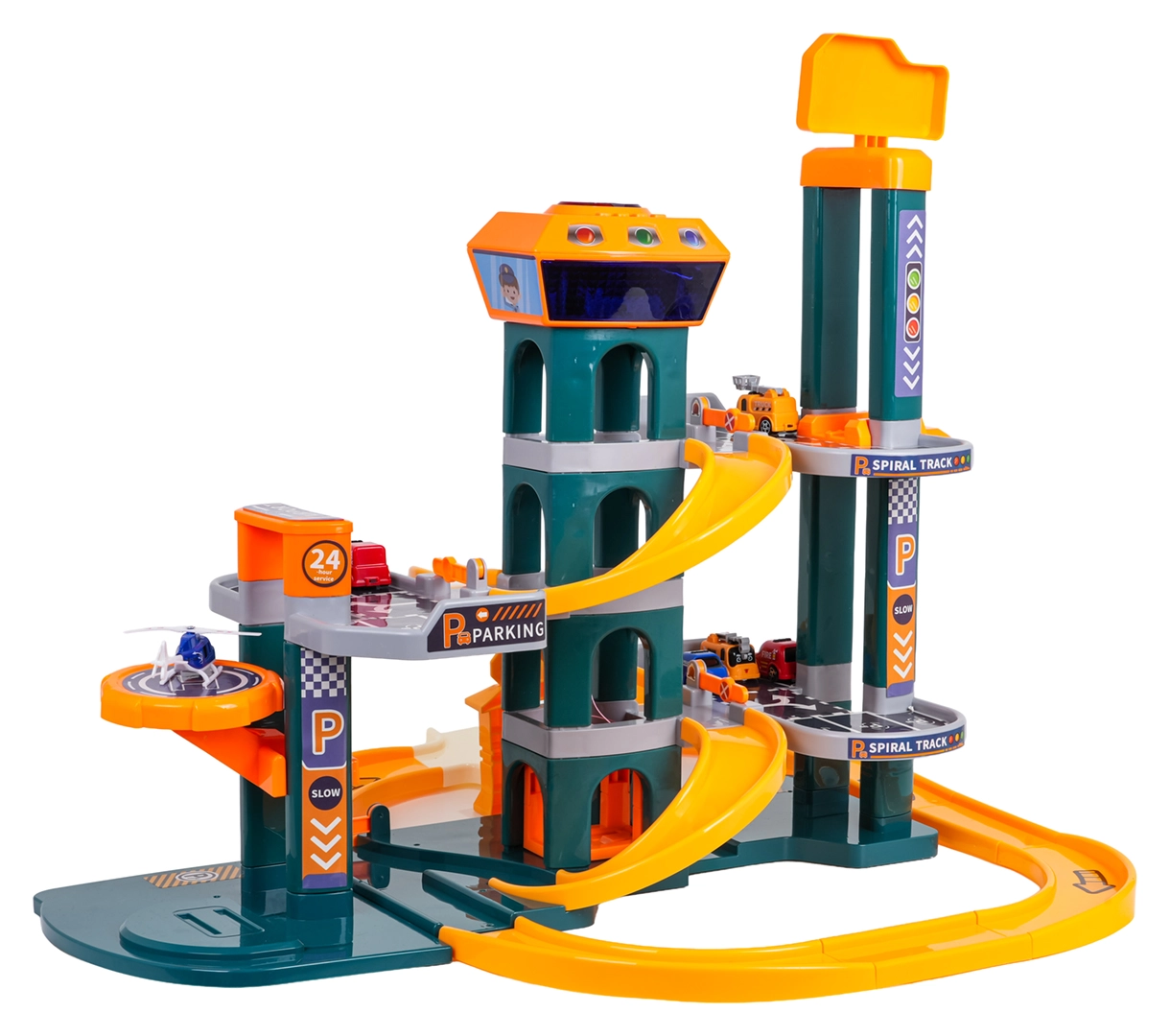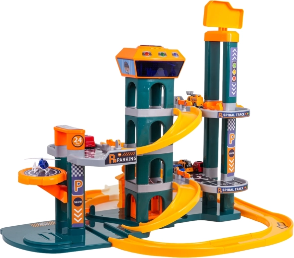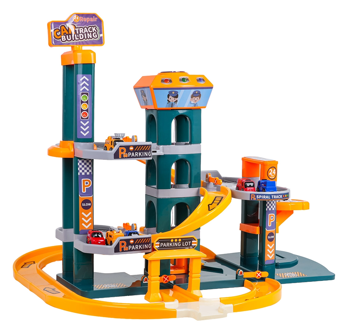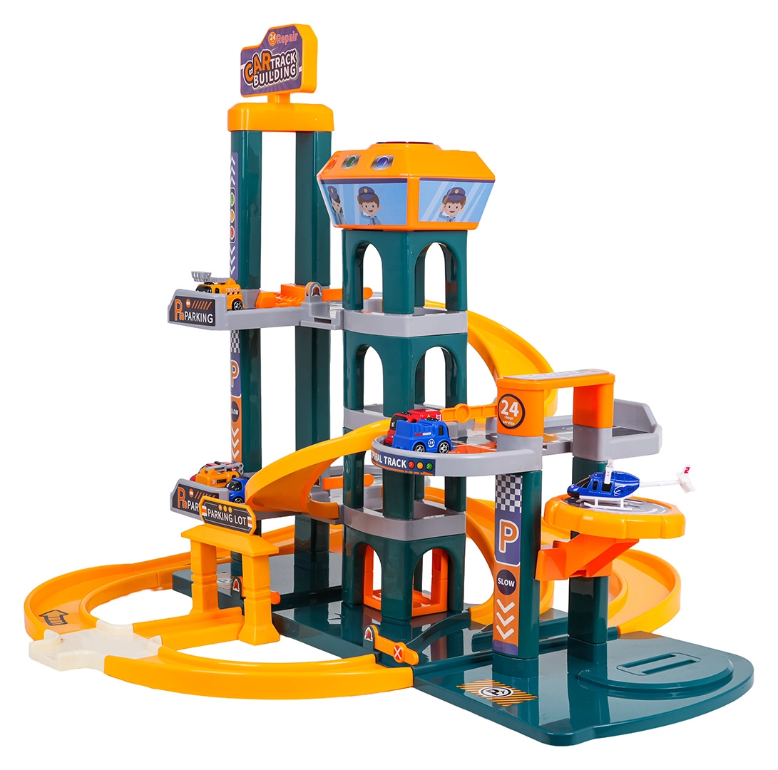 Różne trasy, zjazdy i miejsca parkingowe wspierają kreatywną zabawę i wyścigi. Dzieci mogą na zmianę korzystać z windy i zjeżdżać po krętym torze.