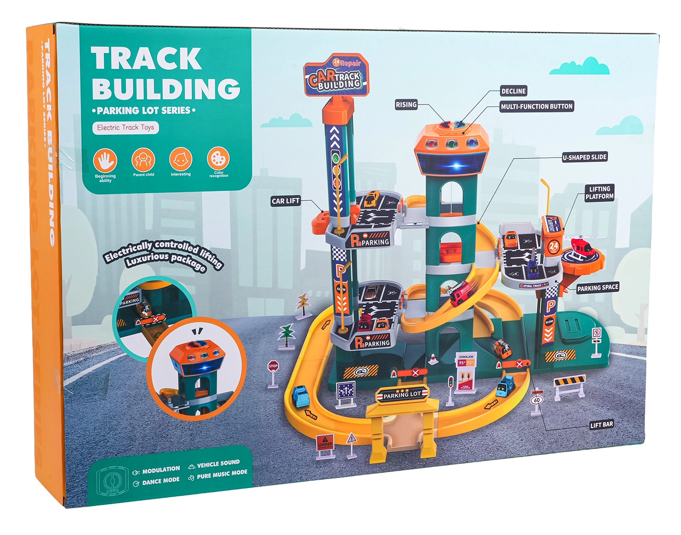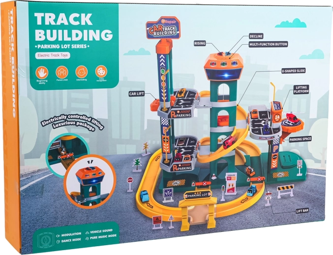 Wwieź autka na górny poziom jednym naciśnięciem. Panel odtwarza wesołe melodie, dźwięki pojazdów i syren, uzupełnione migającymi światłami dla maksymalnych wrażeń.