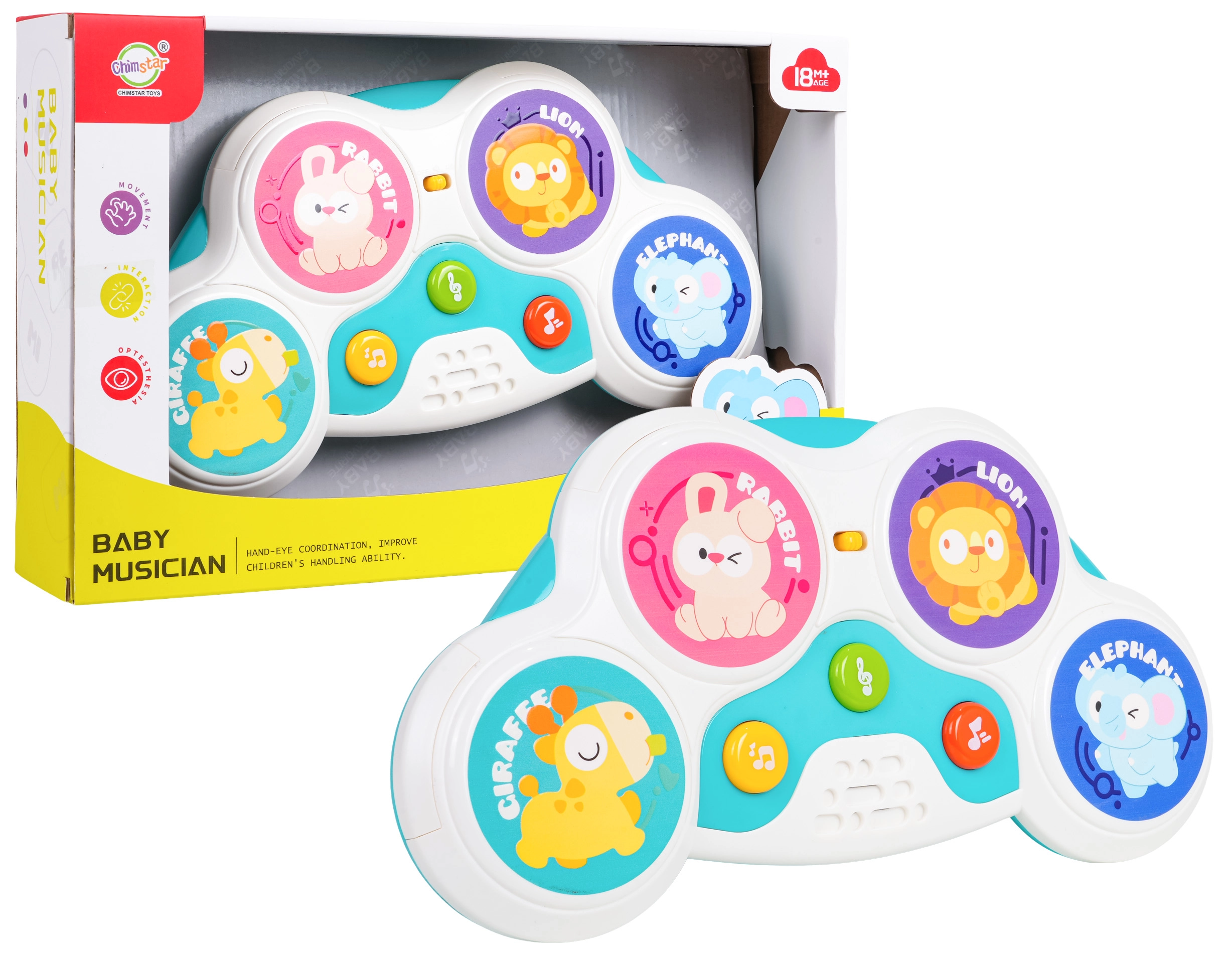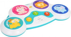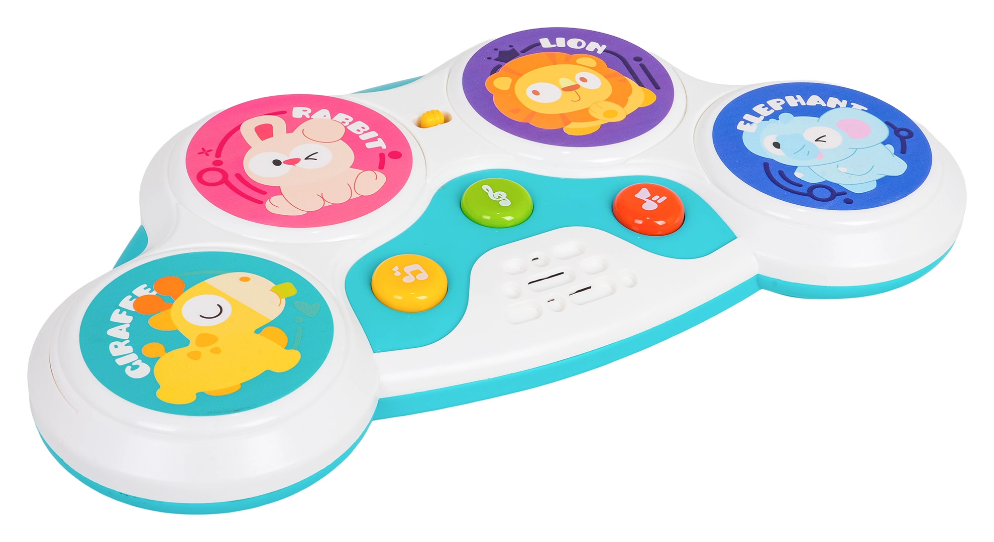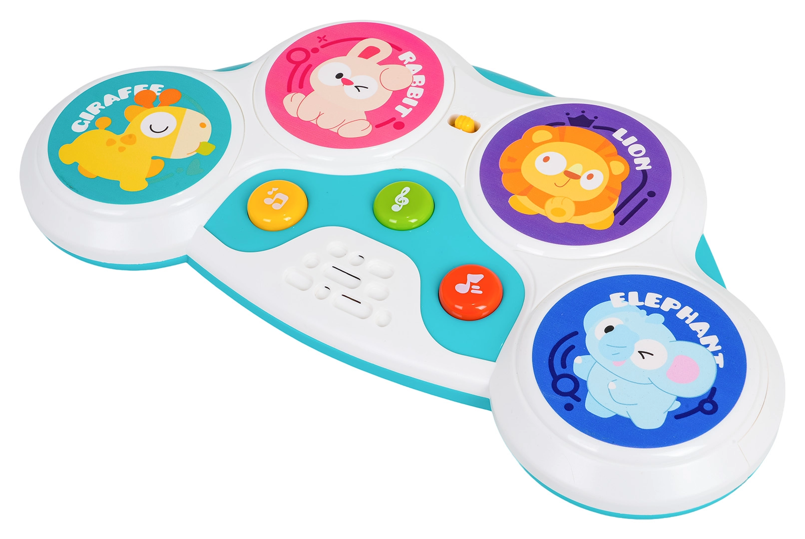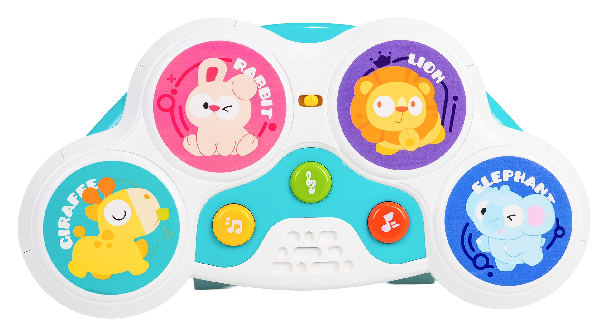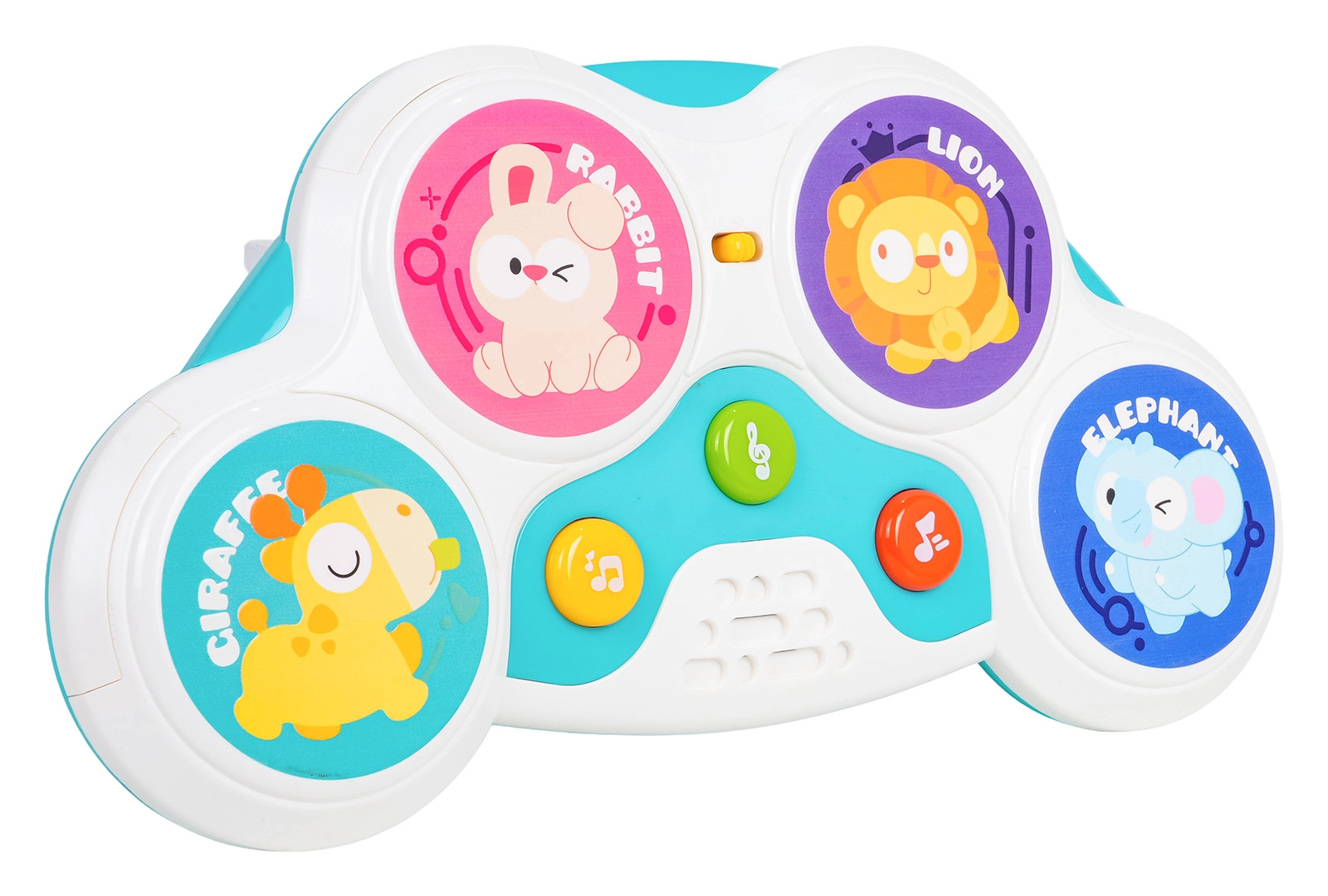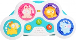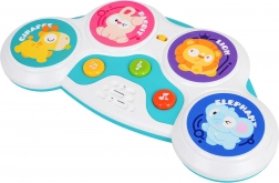 Cztery kolorowe strefy z motywami królika, lwa, żyrafy i słonia uruchamiają odgłosy zwierząt, melodie i bębnowe rytmy — zabawa na jedno dotknięcie.