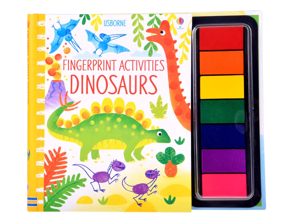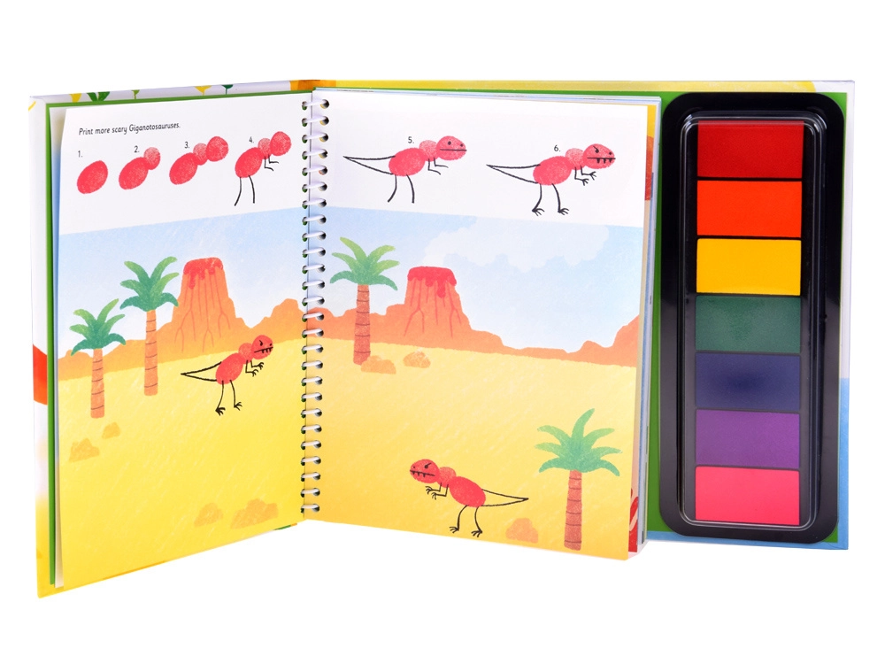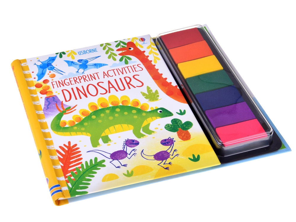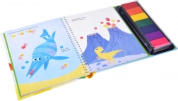 Książeczka do malowania palcami dinozaury to idealny wybór dla dzieci od 3 lat. Na każdej stronie czeka inne prehistoryczne stworzenie i proste zadanie, które dziecko wykonuje za pomocą odcisków palców. Zintegrowana paletka 7 kolorów pozwala tworzyć bez dodatkowych akcesoriów – wystarczy otworzyć i zacząć działać.