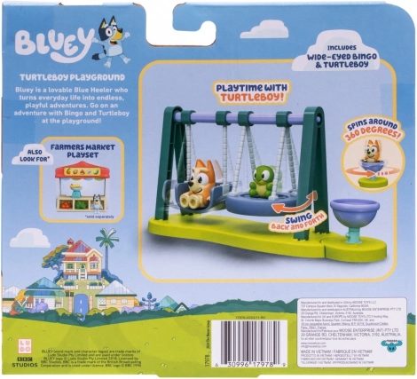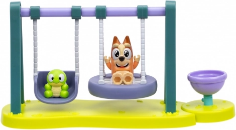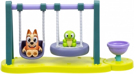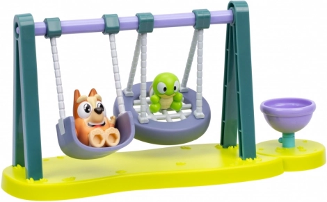 Ten kolorowy mini zestaw do zabawy z huśtawkami ucieszy wszystkich małych fanów BLUEY. Dwie funkcjonalne huśtawki oraz kręcąca się miska/karuzela zapraszają do nieskończonych historii na placu zabaw. Dzieci mogą posadzić Bingo i żółwika, bujać ich w przód i w tył, a potem zakręcić tak, że aż zakręci się w głowie z radości.