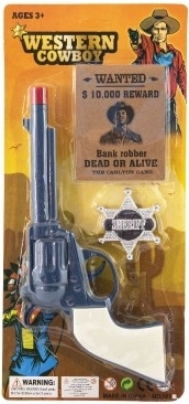 Zostań małym kowbojem! Ten plastikowy rewolwer z odznaką szeryfa ucieszy wszystkich małych rewolwerowców. Broń wydaje klapający dźwięk, w zestawie znajduje się także odznaka szeryfa oraz plakat „Wanted” dla jeszcze większej porcji zabawy. Idealna zabawka dla dzieci od 3 lat.
