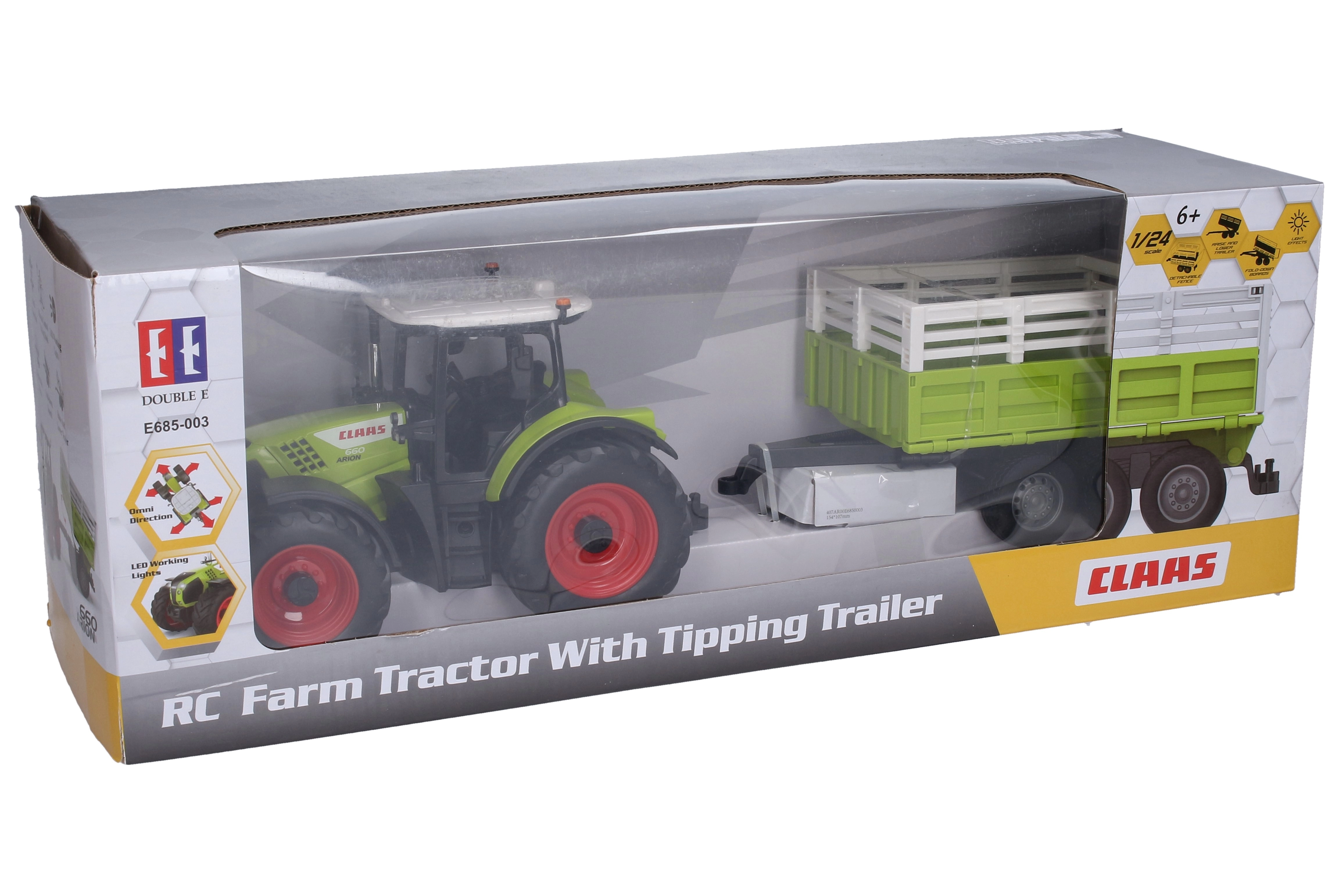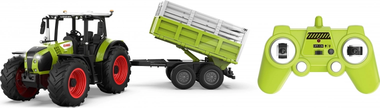 Ciesz się realistyczną zabawą na farmie z modelem Claas traktor z przyczepą na zdalne sterowanie o długości 43,6 cm. Stabilne wykonanie, łatwe sterowanie i dopracowany design ucieszą małych i dużych fanów techniki.