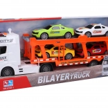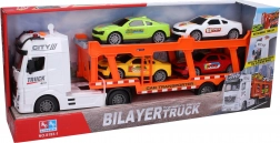 Duża auto-laweta na napęd cierny o długości 56 cm przywozi od razu 4 stylowe auta i zapewnia mnóstwo zabawy dzięki efektom świetlnym i dźwiękowym. Aktywacja odbywa się wygodnie przyciskami na dachu, nie brakuje dźwięku silnika, cofania oraz ruchu platformy. W zestawie są baterie, więc zabawa może zacząć się od razu.