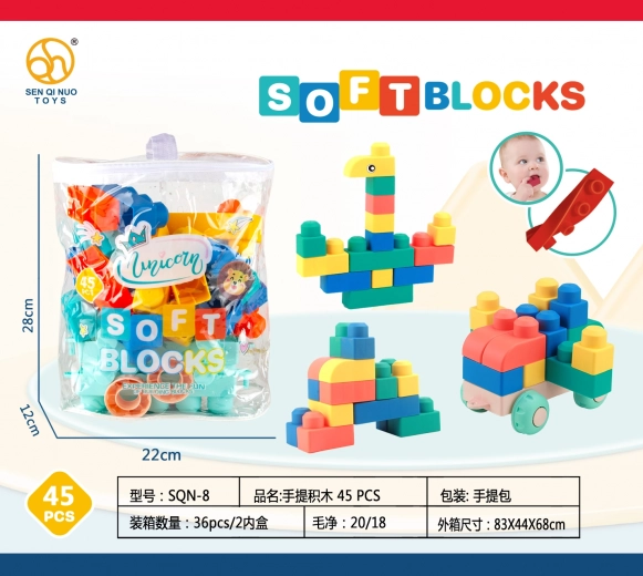 Ten kolorowy zestaw miękkich klocków oferuje 45 elementów do bezpiecznej i rozwojowej zabawy. Materiał jest przyjazny dla dzieci i środowiska, klocki są lekkie, bez ostrych zakończeń i po zgięciu wracają do pierwotnego kształtu. Łatwa pielęgnacja – wystarczy opłukać lub wygotować, kolory pozostają intensywne.