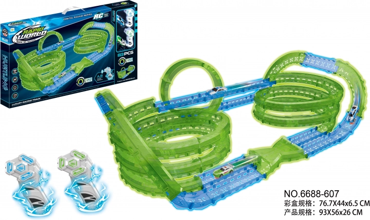 Przeżyj dynamiczną jazdę ze świecącym torem wyścigowym z 83 elementami dla dzieci od 6 lat. Tor jest fluorescencyjny i świeci w ciemności, autka mają podświetlenie LED i są sterowane pilotami zdalnego sterowania. Wbudowane akumulatory w autkach są w zestawie, wystarczy włożyć baterie do pilotów i zabawa może się zacząć.