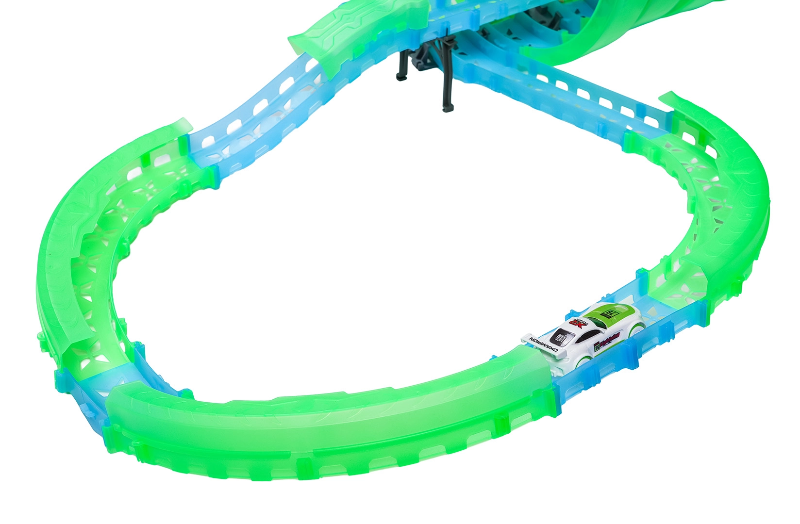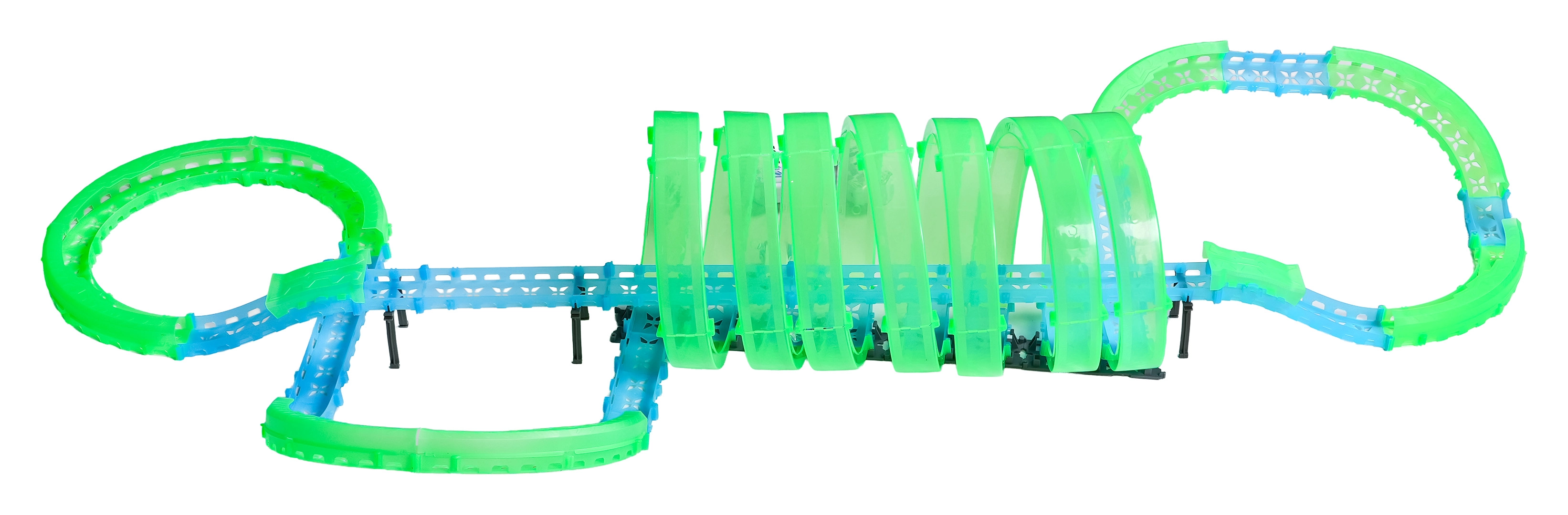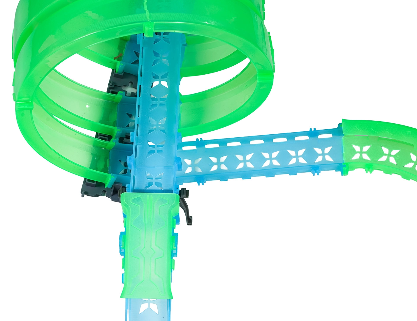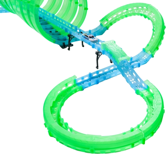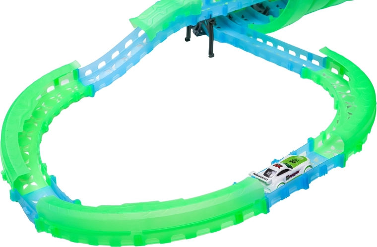 Ten modułowy tor wyścigowy z elementów światłoprzewodzących w neonowej zieleni i niebieskim kolorze łatwo się zatrzaskuje i pozwala na szybkie przebudowy. Fluorescencyjny materiał po naświetleniu rozbłyska, a w połączeniu z samochodzikami LED zamienia pokój w wciągającą świetlną arenę.