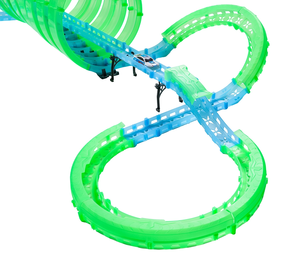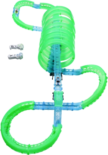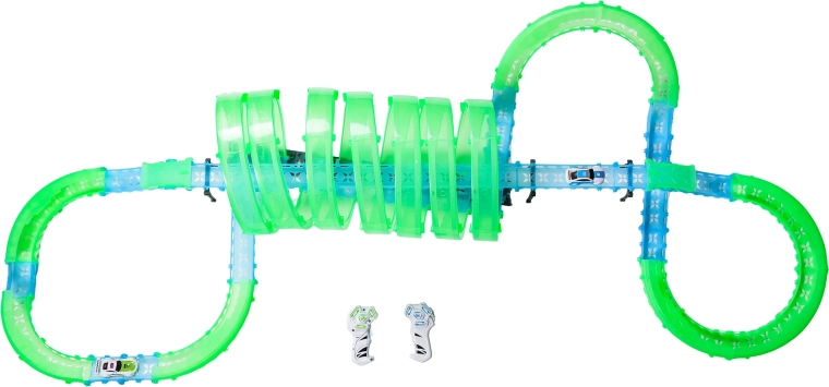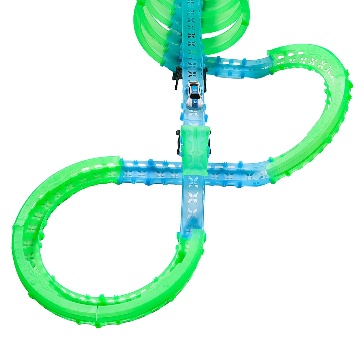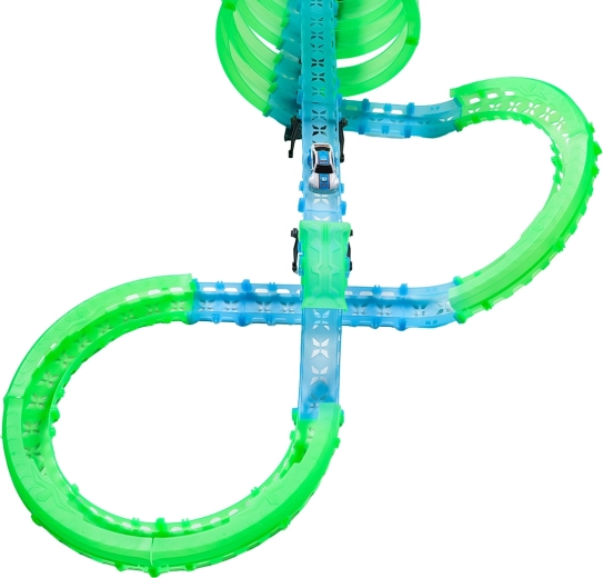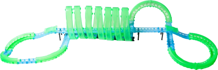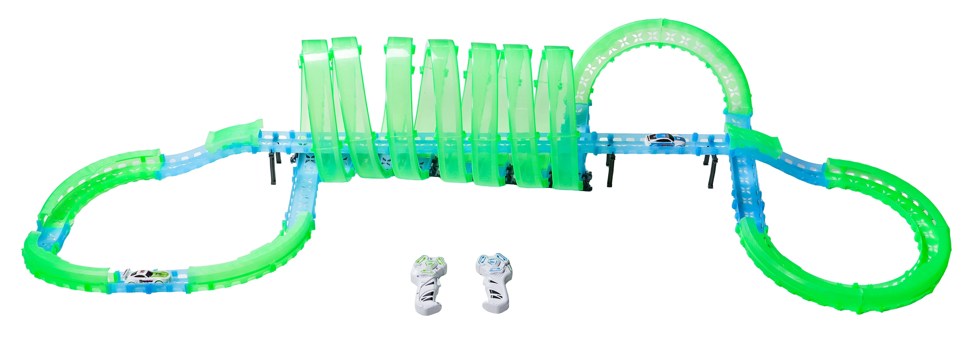 Ten modułowy tor wyścigowy z elementów światłoprzewodzących w neonowej zieleni i niebieskim kolorze łatwo się zatrzaskuje i pozwala na szybkie przebudowy. Fluorescencyjny materiał po naświetleniu rozbłyska, a w połączeniu z samochodzikami LED zamienia pokój w wciągającą świetlną arenę.
