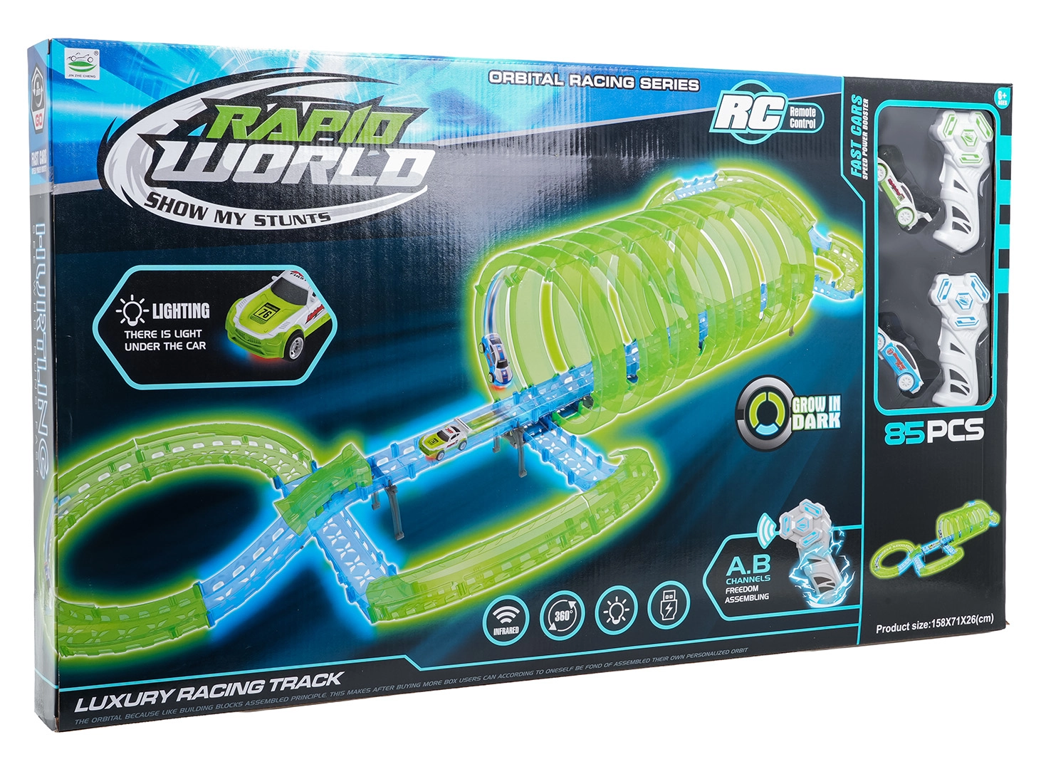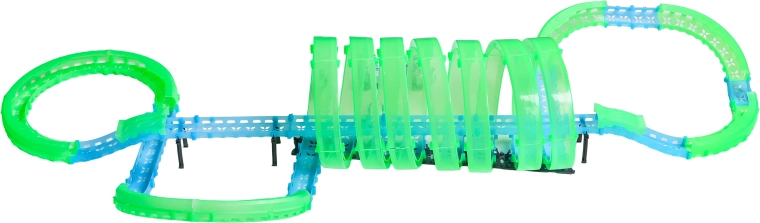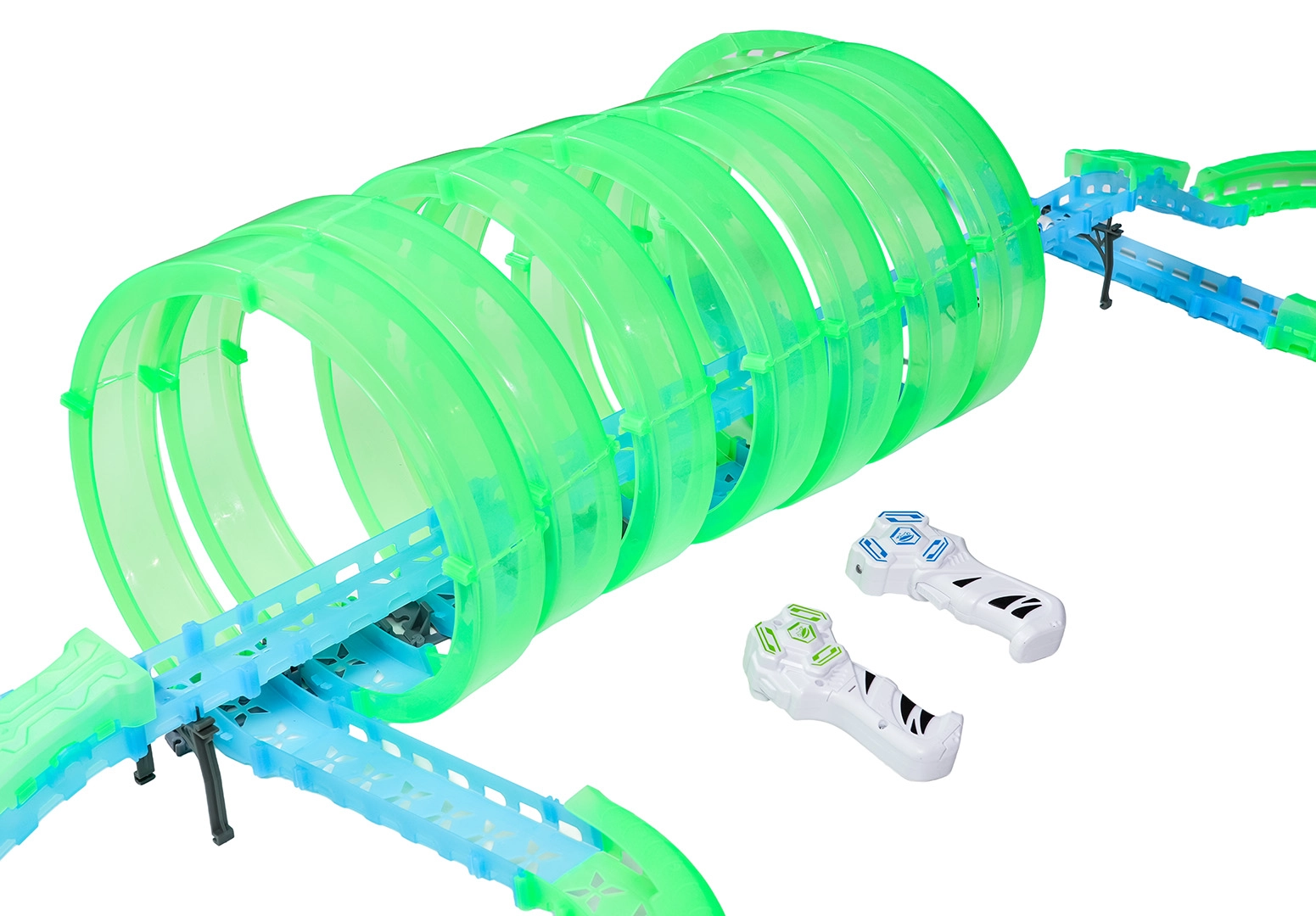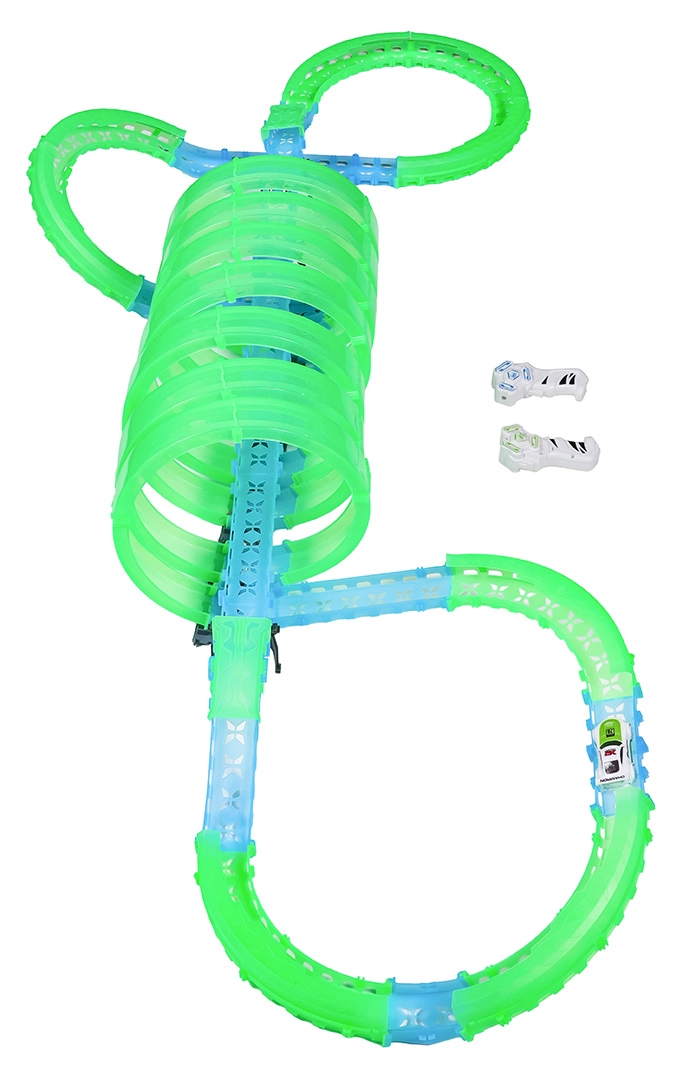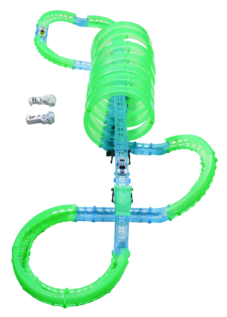 Ten modułowy tor wyścigowy z elementów światłoprzewodzących w neonowej zieleni i niebieskim kolorze łatwo się zatrzaskuje i pozwala na szybkie przebudowy. Fluorescencyjny materiał po naświetleniu rozbłyska, a w połączeniu z samochodzikami LED zamienia pokój w wciągającą świetlną arenę.