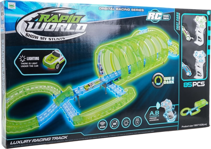Odkryj zabawę ze świecącym torem wyścigowym, który jarzy się w ciemności i oferuje szybką jazdę przez pętle i zakręty. W zestawie znajdziesz 2 piloty zdalnego sterowania oraz 2 ładowane samochodziki z podświetleniem LED, które tworzą imponujące efekty świetlne. Zestaw wspiera kreatywność, małą motorykę i koordynację dzieci od 6 lat.